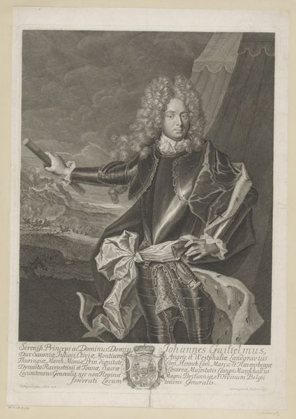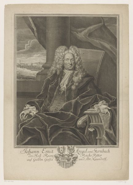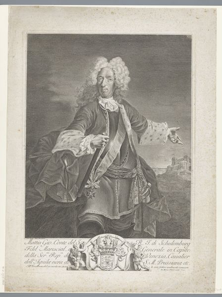 This engraving portrays Johann Anton, Graf von Schaffgotsch, made by Johann Martin Bernigeroth. The symbols of power are immediately apparent: the opulent wig, the armor peeking beneath his robe, and the hand confidently placed on his hip. These are not merely superficial displays, but rather deeply rooted visual cues. The armor, in particular, echoes back to classical heroes, yet here, it's a subtle nod, a memory of strength rather than an active display of it. Think of the Roman emperors depicted with similar nods to military prowess, even in times of peace. This harkens back to the collective memory of leadership and authority, reimagined in the 18th century. Consider the way such symbols evolve. Once, armor was purely functional; now, it's a costume, a psychological assertion of dominance that resonates with subconscious associations of power. The emotional impact is clear – a sense of awe, perhaps, tinged with an understanding of historical continuity. The cycle of symbols progresses, resurfaces, and reinvents itself, reflecting the ever-changing dynamics of human culture and psyche.