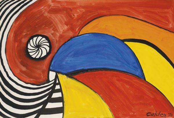 Curator: Isn't this piece delicious? Alexander Calder's "Nautilus and Loops" from 1968 just hums with energy, doesn't it? Acrylic on what looks like paper, a playground of pure, vibrant forms. Editor: It certainly grabs you. I'm immediately struck by its playfulness. It feels very graphic, almost like a poster, but with that unmistakable Calder wiggle. There’s something a bit mischievous about it. Curator: Mischievous is perfect. I think Calder, by this time, was so established that he felt totally liberated to just play. Looking at its reception then, critics either praised his constant innovation or grumbled about the supposed simplicity—you know, the old "my kid could do that" argument. Editor: Exactly. And I wonder if that “simplicity” isn’t precisely the point. Calder was working against the hyper-serious art world, challenging expectations of what "high art" should be. This embrace of basic shapes and bold colors… it feels democratic, accessible. Like art for the people, not just for critics and collectors. Curator: Absolutely! It is like he distilled joy into a visual language. And those loops and spirals! To me, it is more than playful: the work seems to resonate with natural forms: growth, movement, energy. There is a vibrant inner life to even these simple geometries. Editor: I agree. The nautilus, for example, hints at underlying mathematical principles – the golden ratio and so on. Calder, for all his playful spontaneity, was a trained engineer. These structures give the painting a kind of architectural integrity, it keeps your eye moving. Curator: It’s also interesting how, although abstract, it doesn't feel cold or clinical. I suppose this piece represents the sense of hope people felt about space exploration at the time, it seems very ‘of that moment’ – full of colour and wonder! Editor: Right, reflecting that cultural optimism. The fact that Calder's art still feels so contemporary points to his genius, he was very switched-on and receptive of new ideas and perspectives that were very much on the move at that time, which he cleverly weaves into the picture, with a seemingly childlike wonder. Curator: A perfect expression of his ethos. Thank you, that’s something that really shines when thinking about the social context surrounding this artwork and Calder at the time. It really emphasizes the lasting cultural presence of "Nautilus and Loops." Editor: Indeed, and how fortunate we are to engage with its delightful, dancing shapes and what they represent to each of us.