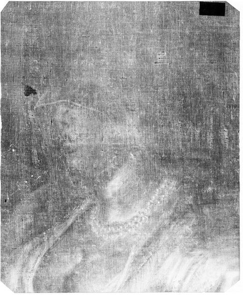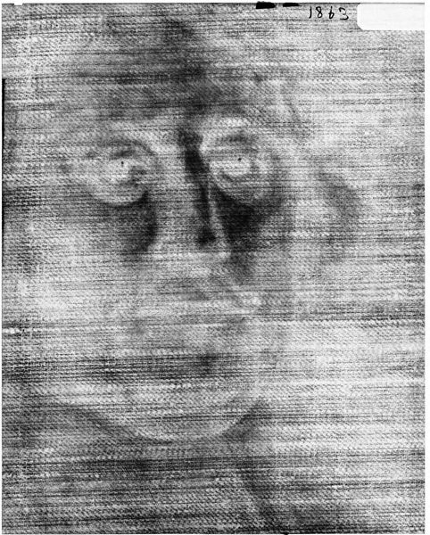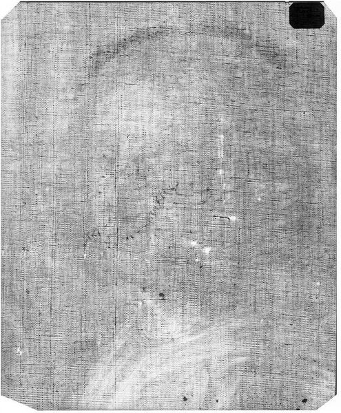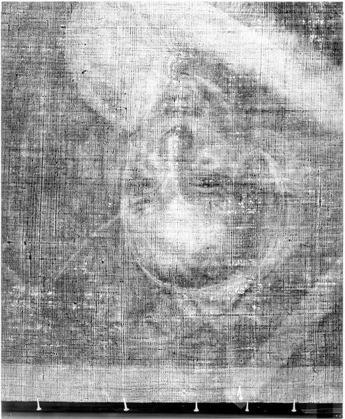 Curator: This X-radiograph, taken of John Durand's portrait "Benjamin Carpenter," reveals the material layers beneath the surface. It's fascinating to see how the artist built up the image. Editor: Initially, I see a ghostly figure emerging from a textured background. The subtle gradations create a sense of depth, despite the monochromatic palette. Curator: Precisely, the X-ray reveals the canvas weave itself, the underpainting, and the lead white pigments used to define Carpenter's features, reflecting the labor involved in creating the portrait. Editor: Note how the denser areas highlight the subject’s face and torso, pulling the eye to these focal points through a stark contrast with the surrounding haziness. Curator: Considering Durand's social standing as a portraitist, this radiography gives us insight into the production of status and identity in colonial America. Editor: The image’s ethereal quality provokes thoughts about visibility, both literally and metaphorically. It's a powerful image.