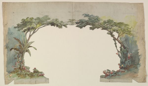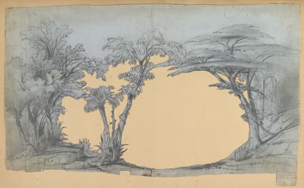 Curator: Let’s turn our attention to Eugène Cicéri’s "Design for a Stage Set at the Opéra, Paris," likely created between 1828 and 1890. The artwork uses watercolor and drawing techniques to conjure up what I imagine to be a highly romantic landscape. Editor: It gives me a rather unfinished feeling, almost like the watercolorist has only laid down a foundation. What story are these theatrical set pieces trying to support, and what labor went into realizing Cicéri's vision for Opéra audiences? Curator: Stage design, especially in the 19th century, was inherently intertwined with cultural projection and, indeed, imperial desires. The Parisian Opéra, more specifically, catered to an elite that actively participated in the creation and upholding of social hierarchies. Here, this lush rendering seems to exoticize a far-away locale for entertainment purposes. Editor: And those social hierarchies extended into the theater itself. Everything down to the very paints—the pigments and the processes involved in their procurement and manufacture—would reinforce the wealth of the patron, and the relative powerlessness of the theater worker. Can you say more about Romanticism's role here? Curator: Certainly. Romanticism in this context, while seemingly focused on aesthetic beauty and an escape into nature, served as a tool to legitimize colonialism, softening its edges through carefully constructed imagery. The trees depicted, the rendering of foliage… it presents nature as something docile, ready to be consumed, reflecting colonial attitudes toward the lands being represented on stage. Editor: I wonder how many workers would be needed to translate this design into a workable stage piece? These "illustrations" or "renderings" also function as an aesthetic product to be consumed by other designers or theatre workers, almost a parallel marketplace. It all brings up interesting questions about art, labor, and design of spectacle. Curator: Precisely! This reminds us that even what appears to be pure artistic expression is enmeshed within sociopolitical networks of meaning. It makes us more critically aware of our role as consumers of cultural imagery. Editor: I will look at theatre backdrops in new ways. Curator: As will I!