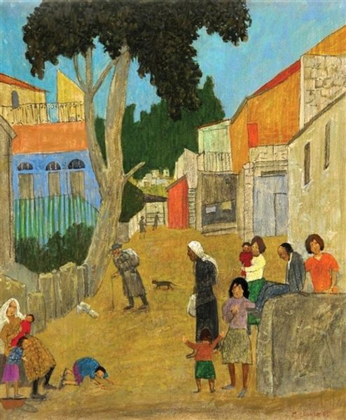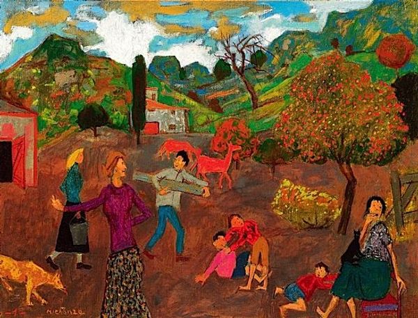This is Grégoire Michonze’s 'Picnic', a scene rich with symbols of community and leisure, painted with a distinctive naivety. The figures gather near the water, some picnicking, others playing, all under the watchful gaze of adults, their faces turned away or obscured. Note the recurring presence of animals, like the deer, which are images of nature, coexisting with civilization, and also ancient symbols of renewal and life. The picnic itself, a shared meal, evokes ancient rituals of communion. The simple, almost childlike rendering of figures and forms echoes the art of ancient cultures, recalling a time when art served communal and ritualistic purposes. Consider how the arrangement of figures—the women nurturing children, the men standing guard—echoes scenes of family and community found throughout art history, from ancient frescoes to Renaissance paintings. Michonze invites us to reflect on the cyclical nature of human experience—the simple joys of life, the ever-present cycle of birth, life, and renewal. This is an image deeply rooted in our collective memory.