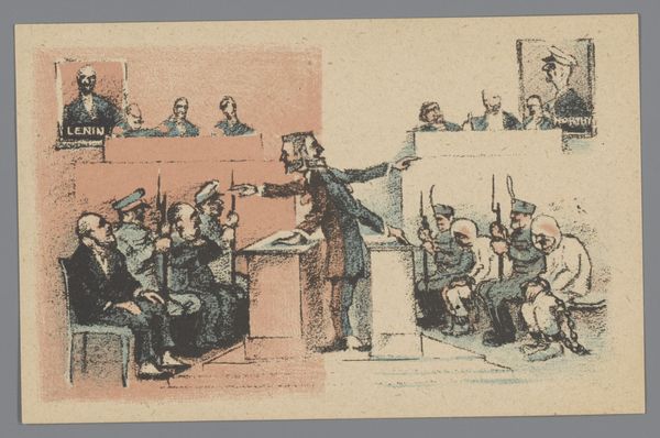 Editor: This is Honoré Daumier’s lithograph, "A la tribune," from around the 19th century. The image has a static feel – a speaker mid-drink, an audience watching – and it all looks hastily rendered, almost like a news sketch. What can you tell me about it? Curator: I'm struck by the immediacy achieved through the lithographic process. Daumier exploits the reproductive capacity of printmaking to disseminate socio-political commentary to a wider audience, almost mass producing dissent. Think about the materials used: the lithographic stone, the greasy crayon. These weren’t exactly tools of high art, were they? Editor: Not at all, which I find interesting. Why this choice of media and style for a political image? Curator: Well, consider the political landscape of 19th century France. Caricature gained immense power, fueled by the relative ease and low cost of printing. Daumier's choice undermines traditional art hierarchies; he uses a ‘low’ art form, accessible materials, to critique powerful figures. It also asks: what is the labor behind such political theatre? Where does power truly reside, in the orator, the printed image, or its reception by the masses? Editor: I hadn't considered the labor involved. The frantic sketching makes it seem spontaneous, but the process of transferring that to a lithographic stone and printing implies careful consideration of reproduction and distribution. Curator: Exactly. The final print circulated, entering into a marketplace of ideas. The paper itself, the ink, all became part of this cultural currency. Editor: That's a very different lens through which to view the piece – looking at its means of production and consumption, it gives an insightful look at the cultural meaning and intention! Curator: Indeed. By focusing on the material and production, we start to unravel assumptions about value and power in art.