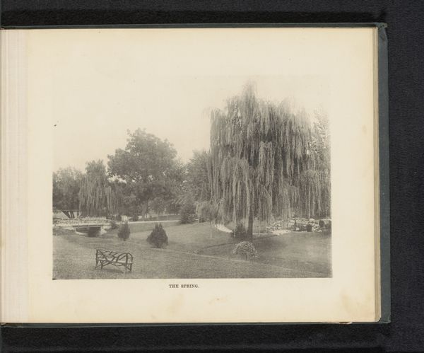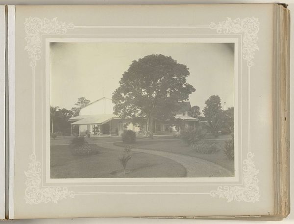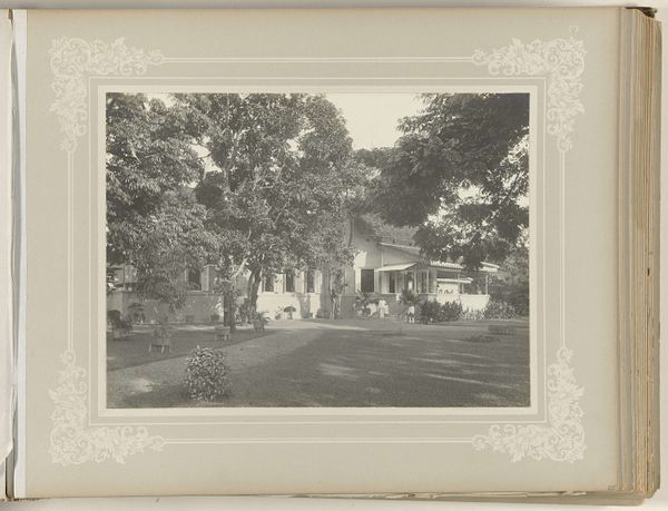 Otto Hisgen made this photograph, "Sam van Musschenbroek op het terrein rond het huis," at an unknown date. The composition is dominated by a foreground of manicured grass and a curved pathway, directing the eye toward a modest house partially obscured by lush trees. Hisgen's lens captures not just a scene, but a study in spatial relationships. The trees, rendered in varying tones of grey, create a screen that both hides and reveals the architectural structure behind. This play of light and shadow destabilizes a straightforward reading of domesticity, suggesting a tension between nature and civilization. The photograph subtly questions the values associated with colonial life through its formal arrangement. The house, a symbol of order and control, is visually softened by the unruly growth around it. This contrast engages with ideas of how environments shape cultural narratives and challenges fixed meanings.