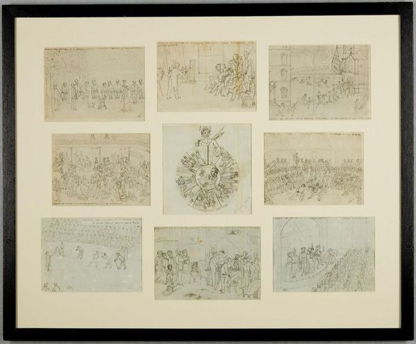 Curator: Looking at "Sleutel op de vier prenten van de laatste dagen van Lodewijk XVI door Luigi Schiavonetti", made in 1796, a certain starkness in the linework announces itself quite powerfully. Editor: Yes, there's a real sense of constraint, isn't there? The pen and ink feels economical, almost journalistic. It's like we're witnessing a sequence of events documented rapidly, emphasizing the factual over embellishment. Curator: I find the choice of rendering these historical moments as a sequence, almost like frames from a film, interesting. Schiavonetti, through his visual shorthand, delivers potent symbols: Louis saying goodbye to his family, addressing the National Convention, all prefigure a dramatic, unavoidable conclusion. Editor: Absolutely. You can sense the layers of class dynamics being scraped bare through the cheap and easily reproduced ink and print format of the work. The focus isn’t on celebrating power through rare and precious material; instead, we witness the depiction of the stripping away of that power. Think about who would’ve bought and circulated images like these back then... Curator: A very astute point. Consider the loaded symbolism inherent to each tableau. Each of these contained moments serve as morality plays or exemplars. Louis shown, separated from loved ones, but facing fate and the Revolution is an emotional and political flashpoint, still powerful generations on. It echoes classic tropes of tragedy. Editor: The deliberate austerity and the lack of pretension in material highlight the crumbling edifice of power at the time. Instead, a new, burgeoning material culture rises with printed images widely shared among diverse audiences: revolution in action! I’d want to see what type of ink was available at the time and from which areas this publication came from! Curator: An intriguing way to consider the reach of such charged imagery, made all the more intense by Schiavonetti's keen grasp of composition and dramatic tension in these pivotal moments of the Revolution and French royalty. Editor: This work’s strength is how its basic materials became an eloquent narrator in their own right during momentous change. We, like those in 1796, are asked to reconsider how something is disseminated, perceived, and, ultimately, memorialized.