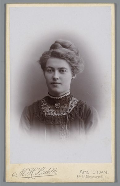 Editor: Here we have an albumen print on paper, titled "Portrait of an Unknown Woman", created sometime between 1885 and 1906, by W.G. Kuijer & Zonen. It's quite charming, the woman's dress feels indicative of the time. What stands out to you when you examine this image? Curator: For me, it's the tangible connection to the Victorian era afforded by this photographic print. Consider the labour involved in creating this seemingly simple portrait. From the photographic process itself, to the paper production, and even the woman's clothing - all representing industries reliant on specific materials and skilled labour. Editor: The level of detail in her lace collar is amazing. Curator: Exactly! Think about the complex network required to produce that lace. Where was the thread spun? By whom? Was it factory-made, or the product of domestic industry? Even the chemicals used to develop the photograph— where did they originate? Whose labor extracted and processed them? Editor: It sounds like a real web of interconnected processes. So looking at it this way, even a portrait becomes a document of its time? Curator: Absolutely. This image is less about the individual and more about what its production reveals. This print speaks to class structures, consumerism, and the material conditions of late 19th-century society. The means of production were transforming daily life. This photo acts as evidence of that transformation. Editor: That’s fascinating. I never thought I could read so much into one image simply by thinking about its materials! Curator: It transforms our appreciation, doesn’t it? Seeing art as evidence, not just aesthetic expression. Editor: Definitely. I’ll never look at photographs the same way again. Thanks for sharing that insightful analysis!