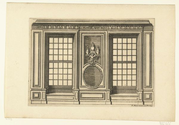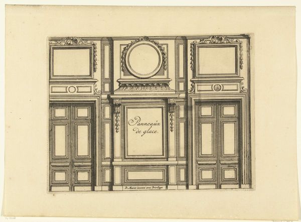 Curator: This engraving, “Muur met schoorsteen tussen twee deuren,” which translates to “Wall with chimney between two doors,” by Daniël Marot, dating from around 1703 to 1712. It offers a fascinating glimpse into interior architectural design during the Baroque period. Editor: It has an incredibly austere and balanced composition. My eye is immediately drawn to the materiality of the elements; the precision of line engraving captures the intended textures of wood, stone, and the reflective “Panneaux de glace,” the panels of glass or perhaps mirrors. Curator: The design's emphasis on symmetry speaks volumes about the social values of the era. This design represents control, order, and hierarchy, very much reflective of Louis XIV's court, where appearances held significant political power. One cannot overlook the portraits featured above each doorway either—perhaps figures designed to subtly imply a patriarchal household, nobility, or other power figures from the past. Editor: It makes you wonder what these walls were truly built of: How much regional difference did the materials represent? Was the wood primarily oak or another lumber easily accessible? To whom were these spaces available; could it be a depiction of what materials that person had acquired, stolen, or generated from the land, representing one’s position in life? Curator: Yes, certainly understanding Marot's intention with this drawing demands acknowledging his patron base—ruling families and other wealthy elites seeking to emulate Versailles’ opulent lifestyle. So considering the impact of colonialism and slavery in providing many of the necessary rare commodities would prove indispensable to interpreting it today, for me. Editor: Exactly, to extend that concept; one might ponder whether this kind of work reinforced an ever-present and tangible gap. The doors, after all, speak volumes on the way in which it might divide both people as well as purposes throughout society; by doing that, the people are then forevermore reminded of social boundaries both within domestic or societal arenas, regardless of whatever era in history. Curator: By considering all factors – from Marot's biography to questions on labor conditions prevalent during that time to analyzing what these rooms communicate historically with our modern sensibilities, – we gain a significantly enriched understanding. Editor: Agreed. This blueprint presents so many critical considerations for interpreting that period. Analyzing elements with those kinds of multiple perspectives in view certainly invites questions which allow a far richer engagement.