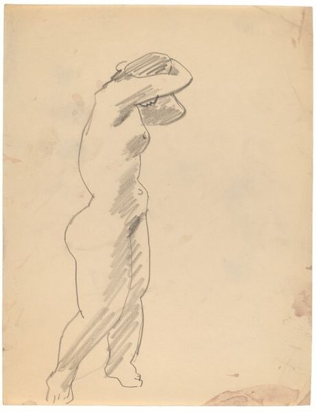Curator: A floating figure, all delicate lines and hushed reverence, is what strikes me at first glance. Almost weightless. Editor: We're looking at Odilon Redon's "Sleep," created in 1898. It's a pencil and crayon drawing, showcasing Redon's signature symbolist style. It’s currently housed here at the Metropolitan Museum. Curator: Symbolism! It resonates, yes. The headscarf reminds me of a nun’s habit or a shroud… is it hinting at spiritual devotion, or perhaps the oblivion of death itself? Editor: Considering the period, we have to recognize how this artwork subverts typical portraiture. Women are so often positioned for the male gaze; here, the subject escapes visibility. Her closed eyes… she isn’t performing for anyone. Sleep as resistance, maybe? Curator: Escape. I love that idea. It does feel like an inner sanctum, a flight from the world's noise. The hatch marks framing her form almost give it the weight of tangible protection, right? Like a shadow protecting the innocence and tranquility that sleep holds. Editor: Shadows play a powerful role here. Remember, Redon was deeply engaged with the burgeoning field of psychoanalysis. "Sleep" reflects this, engaging themes of repression and the unconscious. The lines obscure and reveal, mirroring how we process our experiences. Is sleep then an allegory for coming to terms with trauma, maybe? Curator: Coming to terms...perhaps. Or perhaps it simply exists in defiance of everything that makes trauma unavoidable. A silent scream. An opportunity for the psyche to finally embrace and love itself after being exposed to whatever horror the outside world has subjected it to. Editor: So well said. Redon doesn't give us answers, he provides a space for our own projections, which opens doors to complex themes: the tension between public visibility and private introspection. A woman taking refuge in a dream, refusing objectification. It makes you consider how bodies become sites for resistance in everyday moments. Curator: Absolutely. And even on a purely visual plane, it's about finding refuge and beauty within the ethereal and insubstantial. Editor: That's the legacy of artwork like "Sleep". It can become so much more than art. The piece manages to encapsulate vulnerability while presenting quiet strength. Curator: Indeed. It nudges us to dive head-first into the dream space, which, for many of us, may offer more truth than real-world expectations.