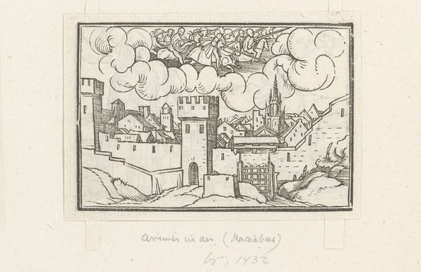 Editor: This is Hans Holbein the Younger's woodcut illustration, "2 Maccabees V." There's something quite haunting about the contrast between the grounded city and the ghostly figures in the clouds. What do you make of this piece? Curator: It's crucial to consider the Reformation context. Holbein's imagery, drawn from religious texts, becomes potent political commentary. The figures in the clouds, perhaps representing divine intervention or judgement, could be interpreted as a critique of earthly power structures. How does this tension resonate with contemporary issues of social justice and power? Editor: That’s a great point. I didn't consider how the religious narrative could reflect societal tensions of the time. Curator: Indeed, art often holds a mirror to its society, reflecting its anxieties and aspirations.