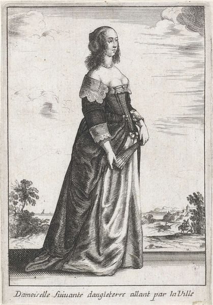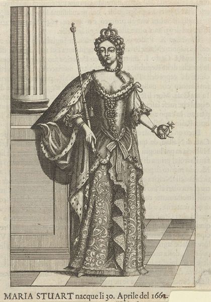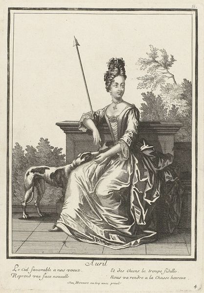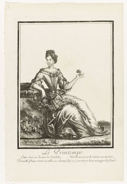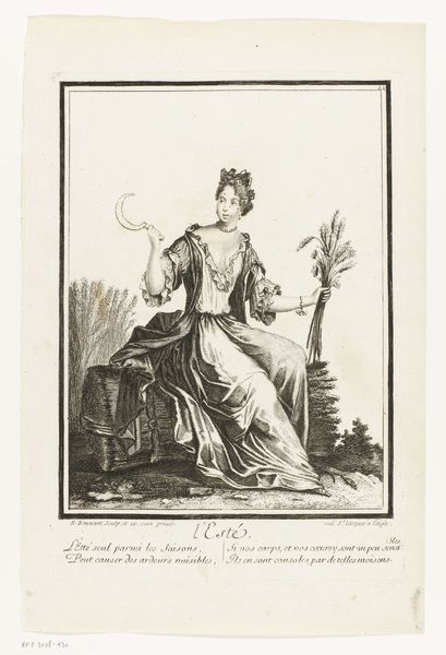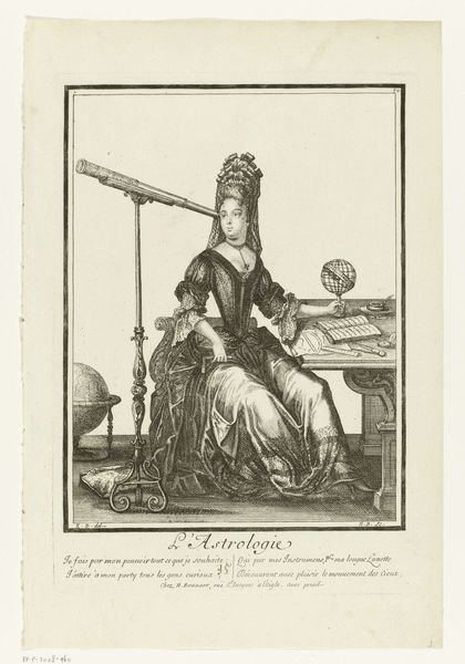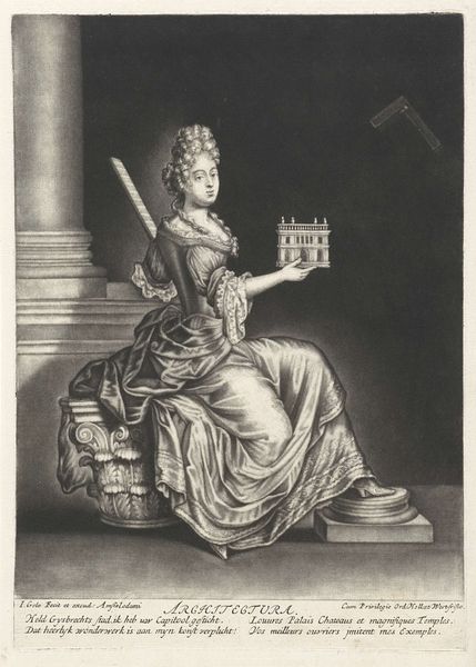 Editor: Here we have "Architectuur," an engraving attributed to Nicolas Bonnart, dating sometime between 1647 and 1718. It depicts a woman holding a miniature building. The intricate line work is really striking; it creates such depth. How do you interpret the composition? Curator: Indeed. The formal structure suggests a dialogue between the concrete and the abstract. Notice the clear, precise lines used to delineate form. Observe the contrasts between the texture of her gown and the smooth surface of the architectural model, which can be seen as contrasting material vocabularies. Consider also the orthogonal lines created by the drafting square against the more organic curves of the drapery. What might that opposition signify? Editor: It makes me think about the precision and order required to create architectural forms, contrasting with the fluid, more natural world. What do you make of the column on the right, which dwarfs the figure? Curator: Excellent observation. The column asserts dominance. It isn’t just a supporting element; it stands for something much more. Note how the artist juxtaposes this symbol of grand, classical architecture with the woman who represents the allegorical concept of Architecture, almost subservient. It might lead one to think about how human creativity relates to lasting achievement. How does her pose affect your reading of the artwork? Editor: She appears thoughtful, almost contemplative, about her creation, holding this building as if considering how it will change the world. The poem under the engraving is about beauty coming from the artist's hand and that children will follow the example. That is not something I would have noticed immediately, without your prompts. Thank you. Curator: It's precisely by engaging with these formal cues and structures that we unlock layers of interpretation and engage more deeply with the work's composition and historical intentions.