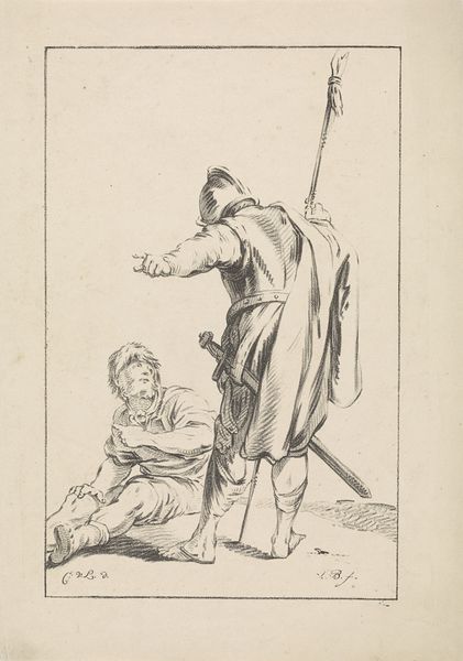 Curator: I’m immediately struck by the vulnerability in Rembrandt van Rijn's “Two Tramps, a Man and a Woman," circa 1634. There's a profound sense of weary itinerancy. Editor: Indeed. This etching provides an interesting glimpse into 17th-century Dutch society. Genre paintings like this often reflected—and sometimes challenged—social norms. It’s currently housed here at the Art Institute of Chicago. Curator: The stooped posture of the figures, the worn clothing—it all speaks volumes about their hardship. Is it possible that the walking stick may stand for vulnerability and even possible destitution? Editor: Absolutely, those visual elements carry significant cultural weight. In the iconography of the era, tramps or beggars were often used as reminders of fortune's fickleness, symbols of societal precarity, but let's not forget that these images helped reinforce certain social hierarchies. Curator: Yes, while seeming to depict common folk with empathy, this type of image certainly served as a cautionary moralizing reminder to wealthy art consumers. The placement within society becomes even more relevant than artistic portrayal when considering who may have been commissioning the piece, as a reminder of what one is, rather than isn't. Editor: Right. And the stark, almost desolate background further enhances this feeling. Notice how the sparse lines of the landscape emphasize their isolation and, perhaps, spiritual journey. Curator: Rembrandt’s mastery with etching allows for incredibly detailed linework, which emphasizes the ruggedness of their features and clothing. It gives their lives a raw honesty. Editor: Rembrandt clearly was trying to elicit not only the likeness of his subjects, but he may have also been aiming to show something else that might connect the image with potential buyers: compassion and recognition. What this means to each potential buyer may have been an interesting experience! Curator: Thinking about Rembrandt’s positionality as a prominent artist… what could have motivated this image for its social environment? Editor: Ultimately, reflecting on the enduring power of symbols makes it clear that there’s a universality to these depictions of wandering souls. I guess it helps keep cultural memory active for audiences today.