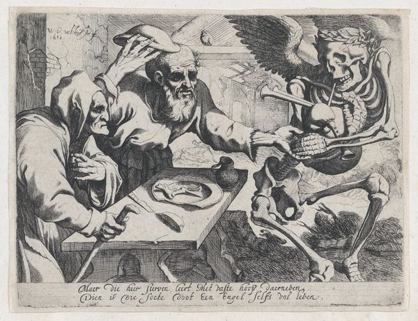 Editor: Here we have "Interior with Three Smoking and Drinking Soldiers" made around 1654 by Gesina ter Borch. It's a pen and ink drawing. What strikes me most is how lively it is, despite the limited medium. I’m curious, what story do you see unfolding in this piece? Curator: I see the performance of masculinity and social status in the Dutch Golden Age. Genre scenes like this gained popularity, offering glimpses into everyday life, yet often with a subtle moral undercurrent. The act of smoking and drinking, associated with male camaraderie and leisure, also carried implications of excess and the transience of worldly pleasures. Note how the dog, a symbol of loyalty, is present, yet seemingly detached from the rowdy behaviour of its owners. Editor: Interesting! So the scene isn’t simply a snapshot of daily life but a carefully constructed image intended for public consumption? Curator: Precisely. Ter Borch, as a woman artist in the 17th century, occupies a unique position. The question is: to what extent did her gender influence her interpretation of this scene? Is she critiquing these men, or merely observing them? How might this scene have been received within the cultural context of the time, and how might it be perceived now? Editor: The presence of a female artist certainly adds a new layer to how we read the work. I initially viewed the image through an aesthetic lens, admiring her economy of lines, but framing it in socio-historical terms definitely makes it more interesting. Curator: Thinking about art as part of broader cultural conversations is critical, and I appreciate that you made that leap! Editor: Thank you for shedding some light on this! I’ll certainly think of art and its history from a wider perspective.