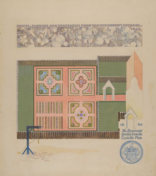 Editor: Here we have Howard Sherman's "Pilaster and Sidewall in Church San Luis Rey Mission," a watercolor painting from around 1936. It's such an interesting, almost schematic view of architectural details. I’m curious, how does this fit into the broader context of art depicting indigenous spaces? Curator: That’s a great starting point. This work presents us with several layers to unpack. How does Sherman’s choice of watercolor impact our understanding, given its historical association with documentation? What statements might Sherman be trying to make? Editor: Well, watercolour feels less…imposing, maybe? More like a record or study than a grand statement. So, it’s not necessarily idealising the space. Curator: Precisely. We must consider the context of the San Luis Rey Mission. These missions had a complicated relationship with the indigenous population. Sherman seems to present an elevation or architectural rendering but strips away the narrative often associated with mission art. Does that diminish a grand sense of triumph? Editor: Definitely. It feels very focused on the geometric details and patterns. It’s almost detached, viewing the Mission as an interesting visual object. It makes me wonder what his intentions were with this piece. Curator: Exactly! And who was this "rendering" for? The intended audience shapes our understanding. Is it an objective historical artifact, a reflection on Indigenous American art movements, or something else entirely? Consider the public role of art within the framework of power dynamics. What narratives are highlighted or concealed in this depiction? Editor: So it sounds like we should focus less on Sherman’s intent and more on how society and institutions at the time viewed and wanted to display these indigenous spaces and motifs. I will be considering those cultural dynamics, it's a different perspective than I had expected. Curator: Precisely! This allows us to consider the intersection of art, power, and public memory and its historical impact on culture.