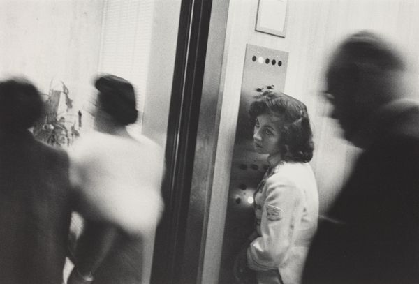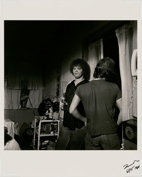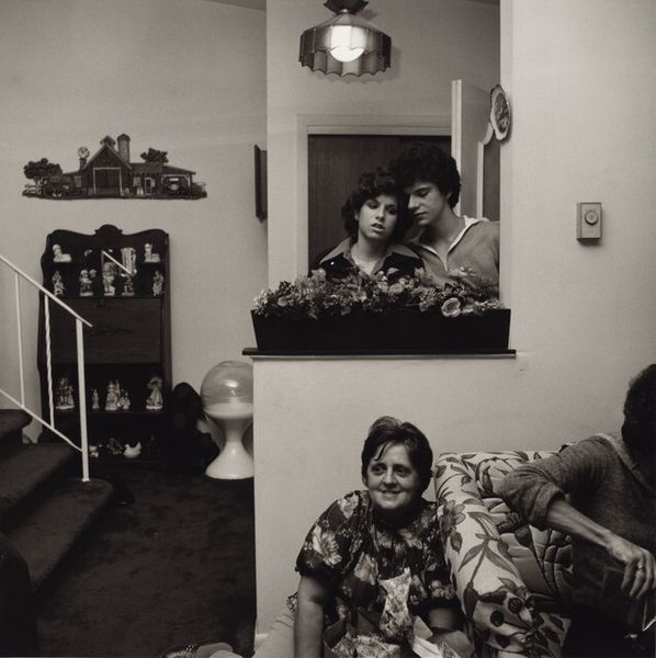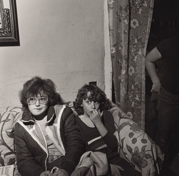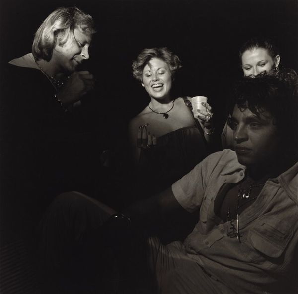 Editor: Larry Fink's photograph, "Pat Sabatine's Eleventh Birthday Party, Martins Creek, Pennsylvania" from 1980, captured with gelatin-silver print. It's stark, but it feels very authentic, almost raw in its portrayal of an intimate setting. What catches your attention most when you look at this photograph? Curator: The accumulation of materials interests me, it reflects lived experience, specifically working-class experience in that area. Consider the beer bottles, the crowded space, the landline phone – each of these is produced and then consumed within specific economic structures. Editor: So, you’re saying the photograph highlights the tangible realities of a certain socioeconomic group at a specific time? Curator: Precisely. It moves beyond a simple snapshot of a birthday. Think about the labor involved in producing all of those things within the frame and how their presence speaks to cultural and economic patterns. What materials would be present today in an 11 year old's party and how does that illustrate new modes of consumption? Editor: I hadn't considered it that way. Seeing it as a record of material culture really adds another layer of meaning. It’s like the photo is presenting evidence. Curator: Indeed, the photograph highlights the production and consumption that defines this social setting and making. But how does this photograph and its composition relate to more conventional types of "fine art" photography that were emerging in this period? Editor: Now that you point that out, I think this is way more genuine. Like you can trust that Fink just captured the real vibe of this birthday! Thanks, I am starting to understand that we can unpack so much from just one image. Curator: Exactly! The magic is that by focusing on the material realities, we learn about larger economic systems, labor and people in an exciting way.