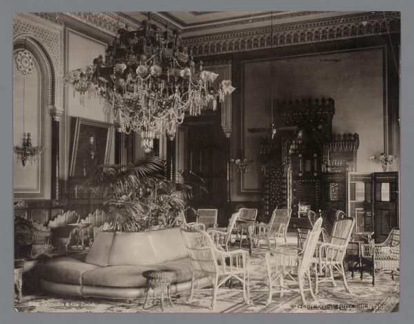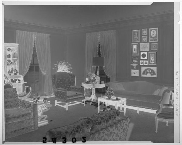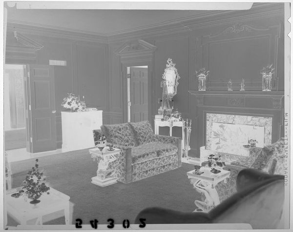 Editor: This is an untitled photograph of a living room interior with floral couches and a fireplace, by Martin Schweig. It’s hard to pin down a date. It looks rather formal and posed, doesn’t it? What catches your eye? Curator: The photograph presents a curated, idealized domestic space, revealing much about social aspirations. The symmetry, the ornate details… it speaks to a desire for refinement, but also perhaps anxieties around status. Consider the role of photography itself at the time; it democratized portraiture but also became a tool for reinforcing social hierarchies. What do you make of the fireplace? Editor: It's a focal point, literally framing the domestic hearth as a staged setting rather than a functional space. Curator: Precisely! The floral couches and fireplace contribute to a narrative of idealized domesticity. It also makes me consider who is absent from this photograph. Editor: I never thought of that! It really does reveal so much about cultural values and social dynamics just by looking at what's included, or excluded.