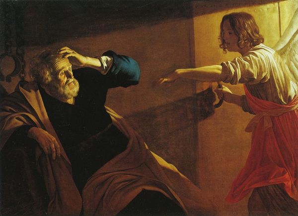 Editor: This painting is Gerard van Honthorst’s "The Denial of Saint Peter," created around 1620 using oil paints. The single candle in an otherwise dark scene really sets a dramatic and tense mood. What strikes you most when you look at this piece? Curator: For me, it's the power of that darkness you mention. Honthorst wasn't just playing with light, he was actively engaging in a political and religious conversation. Remember the context: this is the Dutch Golden Age, a time of religious upheaval. Editor: Oh, right, the Reformation! Curator: Exactly! So, what does it *mean* to depict a Biblical scene with such blatant theatricality, in this moment? This dramatic use of *chiaroscuro*, made popular by Caravaggio, isn't merely stylistic. Editor: It feels like… he's pulling us, the viewers, into this conspiratorial huddle. Making us complicit. Curator: Precisely! And think about where paintings like this would have been displayed – likely in wealthy homes, reinforcing a specific kind of piety and moral reflection. Was this meant to incite public virtue? And did the buyers even perceive this moral aspect of this "history painting"? Editor: That is, by confronting Peter’s fallibility, one confronts their own? The interplay between religious subject matter and political messages makes me appreciate the cultural role artworks play in reflecting values. Curator: Exactly. It prompts you to look at your current world with such awareness, always questioning the visual messaging within culture.