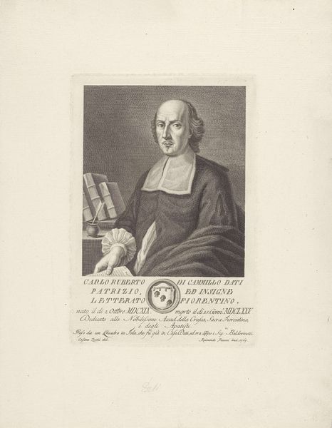 Curator: This is Justus Chevillet’s engraving of Benjamin Franklin, it’s undated, but Chevillet lived 1729 to 1790. The print, rendered in ink on laid paper, captures Franklin in an oval frame above an inscription. Editor: The composition feels very formal, almost staged, but Franklin's eyes seem to hold a spark of something unconventional. The fur collar hints at a certain level of material comfort and status. Curator: Consider the context—engravings like these were essential for disseminating images and ideas. They functioned as a kind of reproducible portrait, making Franklin's image widely available. Editor: The oval frame is a fascinating symbol. It both contains and elevates Franklin, suggesting an almost classical, idealized status. But what does it mean to frame such a revolutionary figure? Curator: The means of production are key: The labor involved in the engraving process itself, the paper, the printing—all contribute to the aura of the subject. Editor: It's a powerful image, laden with the visual language of its time and the echoes of Franklin's legacy. Curator: Indeed, the print allows us to consider the material and social conditions that shaped how Franklin, and revolutionary ideas in general, were consumed.