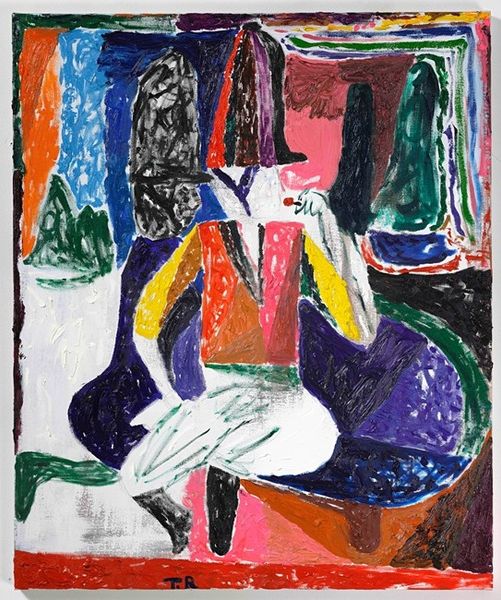 Curator: Here we have Pablo Picasso's "Le chien dalmate," or "The Dalmatian Dog," created in 1959. It’s a striking piece. Editor: Indeed. My initial reaction is one of playful unease. The color palette is restricted, almost somber, yet the subject, a Dalmatian, is inherently whimsical. There’s a tension created by that juxtaposition. Curator: Let's consider Picasso's process. It is acrylic on canvas, isn't it? In the late 50's, Picasso was very productive across mediums, yet painting offered an opportunity to investigate materials at a large scale. The application feels rushed, gestural even. You can sense the immediacy. The purple hues, though, they are intriguing given the availability of synthetic pigments during that era... Editor: Precisely. The texture itself contributes to the dynamic effect. Notice the flat planes of purple interspersed with areas where the underpainting shows through? It’s not a seamless, polished surface. This conscious decision guides our understanding of the work. Do you read the monochrome of the human face looming above the pup? Curator: I see a direct reflection of the dog in the human. It looks less like "high art" and more like public art, perhaps spray painted by hand. This feels like Picasso embracing techniques used among laborers and everyday members of the working class. I find myself thinking about his relationship to craft... Editor: That is possible. Speaking more specifically to formalism, the Dalmatian itself is rendered almost as a series of shapes, deconstructed and then reassembled. It echoes his Cubist explorations, but with a newfound fluidity. Its placement, near the bottom edge, anchors the composition, but also feels precarious. Curator: Perhaps, the precarious feeling alludes to working-class precarity in 1950's France, a time that also witnessed increased domestication and regulation of labor... Editor: An interesting point! It also opens our minds to seeing things, literally, differently, and prompts new interpretations and insights. Curator: Precisely, there are still new conversations and material relations to be explored around art and life.