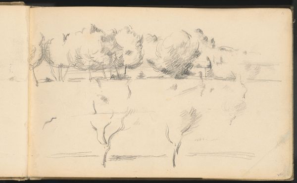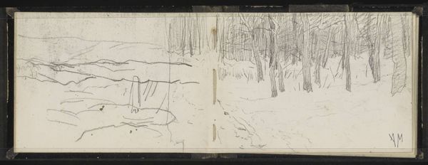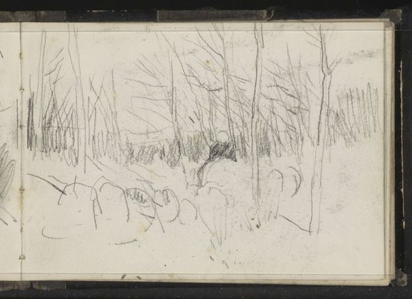Curator: Let's turn our attention to "Bospaden," a pencil drawing created in 1873 by Johannes Tavenraat and held at the Rijksmuseum. What's your initial impression? Editor: Sparse. There's a feeling of something half-formed, skeletal almost, about this lightly sketched forest path. I'm drawn to the raw texture of the paper showing through the lines. Curator: Indeed. Tavenraat worked during a period where landscape painting and drawing enjoyed considerable popularity, mirroring a romantic appreciation for the natural world and national identity. This drawing allows insight to the romantic landscape tradition in the Netherlands, don't you think? Editor: Possibly, though I am most intrigued by how it demonstrates the labour of field work in landscape painting; how can an artist depict nature while engaging directly with their means of production in an efficient way? Curator: A very valid point. But perhaps its seeming unfinished quality offers more a sense of immediacy. How art training was organised, for example. Remember landscape artists frequently used preparatory sketches as studies to be translated later into larger studio paintings for exhibition in the academies, where they became increasingly relevant as state institutions. Editor: To be clear, the sketch offers insights beyond its status as simply ‘preparatory material’ – let’s consider what its materiality affords the landscape artist. Its simplicity is suggestive for me. The limitations, even, of the material push us toward engaging with our ecological footprint in the world around us, if only just for a moment. Curator: Interesting take. Thinking historically, Tavenraat's choice to depict a seemingly ordinary scene aligns with the broader Romantic era's fascination with the sublime in everyday nature. This isn't a grand vista, but a quiet, intimate moment. Editor: It is. It prompts reflection about the making of the drawing. What decisions was Tavenraat considering in marking the page so lightly with very little visual depth and a close handling? Curator: Ultimately, "Bospaden" offers more than just a glimpse into Tavenraat's technique; it’s a portal into understanding both the artistic conventions and emerging political and cultural sensibilities of 19th-century landscape art. Editor: A sketch, then, is both the idea and object to inspire material reflection, no matter how quickly drawn. Thank you for contextualising it!