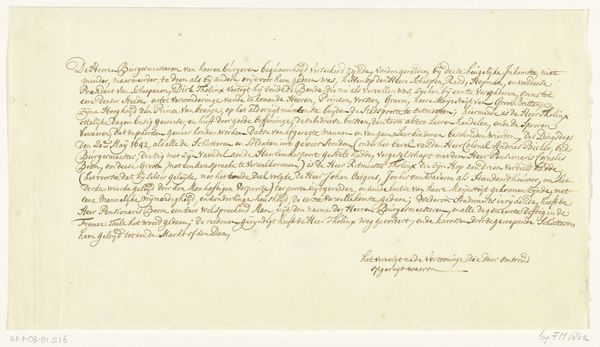 Editor: This handwritten list, dating from the 18th century, details a snake fire hose and its accessories, sent to the Mennonites in Wageningen. It's intriguing—the meticulous script, the way the ink has faded... what strikes you most about this piece? Curator: I'm fascinated by what this object tells us about the relationship between religious communities and civic infrastructure in the 18th century. The Mennonites, as a dissenting group, wouldn't necessarily have been integrated into the formal power structures. This document points to a negotiated role – they’re receiving vital equipment, but the record is kept, likely by someone outside the community. Who was keeping it, do you think, and why? Editor: Perhaps a government official? It reads like a receipt of sorts, a formal acknowledgement of resources allocated. Curator: Precisely. And that speaks volumes about the complex social dynamics at play. This wasn't necessarily charity; it's more like resource management viewed through a lens of social obligation, perhaps even surveillance, where the authorities tracked who held this vital equipment. Think about it in relation to the political and social changes occurring around that time. Editor: It really highlights how something as simple as a list can reveal power dynamics. I wouldn’t have considered the broader implications of civic responsibility and religious community relations without your perspective. Curator: And I am prompted to ask if similar distributions of essential services, were systematically provided to other religious communities within this locale and period? Another set of questions, stemming from a single document!
