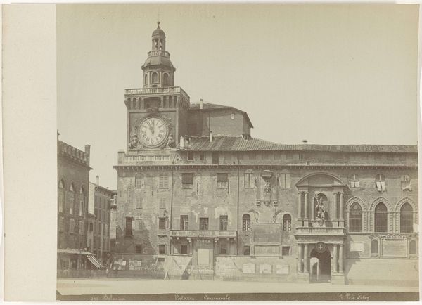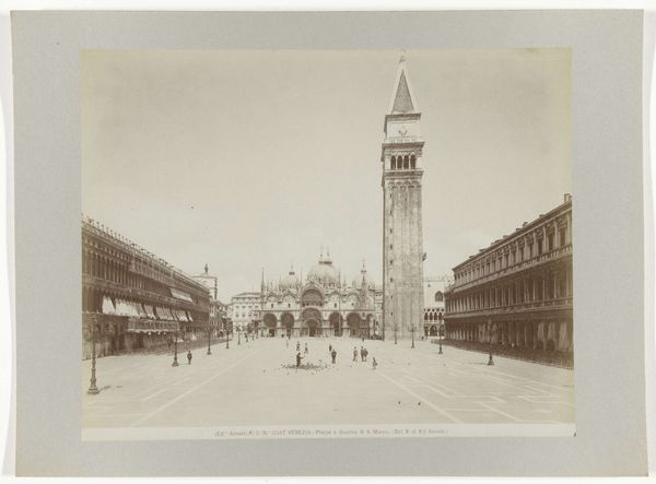 Curator: This evocative photograph, a gelatin-silver print from around 1880 to 1895, captures the facade of Santa Maria Novella in Florence. It's credited to Fratelli Alinari, a studio renowned for documenting Italian art and architecture. Editor: My immediate impression is one of monumental serenity. Despite the presence of people and carriages, there's an almost dreamlike stillness, emphasized by the sepia tones and the expansive, sun-drenched piazza. Curator: Precisely. The composition emphasizes the Renaissance ideal of harmony and proportion embodied in the facade, created by Leon Battista Alberti in the 15th century. Observe the careful balance of geometric forms: squares, circles, and rectangles. The facade is, itself, like an icon of classical order. Editor: It speaks to a particular moment in history. Photography, then, served not just as documentation, but as a tool of empire and cultural authority. Think about who had access to this image, what stories it told about Florence and Italy to a European audience hungry for 'Grand Tour' experiences, and how the indigenous working-class may have experienced it. Curator: Yes, the photograph invites us to contemplate the symbolism inherent in Renaissance architecture. For instance, the upper level draws heavily on ancient Roman triumphal arches, a visual assertion of Florence's status as a 'New Rome', reborn after the Medieval era. And you see that ocular window there above the portal, and the emphasis on horizontal balance and proportion? Those echo Roman concepts of perfection. Editor: And I’m drawn to the stark contrast between the enduring power of the architecture and the fleeting presence of the figures in the piazza. Their daily lives are set against a backdrop of almost unimaginable historical and symbolic weight. It is not simply a static picture, it creates dialogue and historical record between power and people. Curator: The use of light in this piece gives it staying power. Sunlight softens the outlines while clarifying all its salient details and embellishments. It has a near reverential presence for its time and place, and helps create this overall sense of sublime balance and near perfection, both aesthetic and mathematic. Editor: I find myself pondering, then, about photography’s own claims to truth and objectivity. What was left out of the frame? What narratives were intentionally, or unintentionally, suppressed? What stories were captured in light but, unseen by those that held the light, would fade with its absence? Curator: Well said. "Voorgevel van de Santa Maria Novella te Florence" truly holds its own for interpretation through a modern and classical context. It's a rich study in symbols. Editor: Yes, and considering its social dimensions also illuminates a story about image-making and social realities during that era.