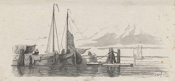 Abraham de Verwer made this drawing of a river scene with pen and brown ink, and gray wash, around the mid-17th century. It depicts a common sight in the Netherlands during its Golden Age: a bustling waterway filled with boats, reflecting the nation's reliance on maritime trade and transport. The visual language employed here is quite telling. Note the grounded vessels in the foreground, rendered with an attention to their material presence. These details speak to a culture deeply invested in seafaring. This was a society fueled by mercantilism, and artists like de Verwer were, knowingly or not, documenting that moment. The Dutch Republic was also fiercely independent at this time, having separated from Spanish rule. The rivers were of strategic importance, so depictions of them also implied the wealth and power of the new nation. To fully appreciate this drawing, one might delve into Dutch maritime history, economics, and even cartography. Art, in this sense, is inseparable from its social and institutional context.