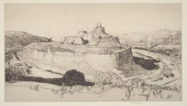 Henry Rushbury made this etching, titled "Les Baux," using lines to define forms and create a sense of depth. The subject is a medieval village perched atop a rocky landscape, rendered with an almost obsessive attention to detail. The composition is dominated by the interplay of light and shadow, giving the buildings and rocks a tangible, almost sculptural presence. Rushbury masterfully uses hatching and cross-hatching to build up tonal contrasts, emphasizing the rugged texture of the stone and the dramatic angles of the architecture. We can see how the detailed foreground transitions to the softly rendered background, creating an atmospheric perspective. Consider how Rushbury's technique invites us to contemplate the relationship between human-made structures and the natural environment. Through his intricate linework, Rushbury doesn't just represent a place but evokes a sense of time, history, and the enduring tension between decay and permanence. The formal qualities of the etching thus serve as a meditation on our place within the larger narrative of time.