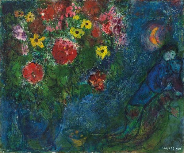 Curator: Emil Nolde created "Flower Garden, Kneeling Woman with Hat" in 1908 using oil paint in the Expressionist style. What’s your initial reading of this piece? Editor: Riotous! At first glance, it's almost pure color and texture. The impasto is so thick; the painting seems almost sculpted rather than painted. There’s a visceral energy here. Curator: It resonates with a sense of primal joy, doesn't it? Flowers often symbolize fragility and beauty, but Nolde presents them with raw energy. There's a defiance there, a rebellion against traditional floral iconography. Editor: Absolutely. Looking closer, the woman almost disappears into the flowers; the garden seems to absorb her. It's not a serene portrait; there's a sense of immersion, a complete merging with nature. Semiotically, that obscuring tells us so much. Curator: Right. Her presence, nearly swallowed by the bloom, reminds me of ancient earth mother goddesses connected directly to vegetation. In this way, she embodies a profound connection to the cycles of nature, to growth and decay. This wasn't mere representation. Editor: And look at how Nolde uses complementary colors – the reds against the greens, the purples against the yellows. It's less about rendering what's *there* and more about constructing a world driven by sensation. How can we talk about truth to reality when what really matters are shape and colour, as you were pointing out? Curator: Precisely. Consider the symbolic power inherent in choosing such a vibrant, unrestrained palette. He invokes Dionysus here. Rather than Apollonian reserve, Nolde offers ecstatic embrace. This echoes deeply held anxieties during industrialization, reflecting on what society loses to production: our link to Earth, symbolized by wild abandon and not structured beds. Editor: So, looking at the painting as a structured and coded system – how it's using color and form to produce a very *particular* feeling or concept rather than simply showing us some flowers? I can definitely see that! Curator: Indeed, the garden is anything but Eden; it’s a living, breathing entity with symbolic weight far beyond botanical illustration. Editor: Well, it's certainly made me think about how surface and substance can combine to express profound meaning. Curator: And for me, how images continually evolve, retaining whispers of old archetypes in new forms.