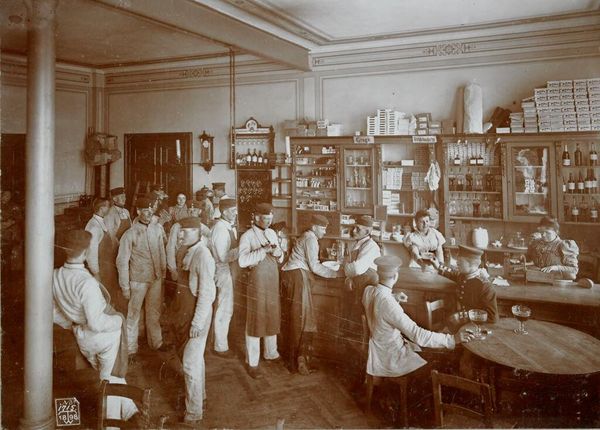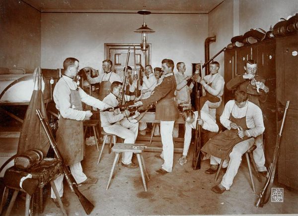 Editor: This photograph by Waldemar Titzenthaler, entitled "War: Germany. Berlin. Prussian Guard Regiment," depicts soldiers preparing for inspection. The sepia tones give it a somber, regimented feel. What do you see as particularly important in this image? Curator: It’s a window into the performative nature of military culture. The photograph reveals the intense preparation involved, but what does it conceal about the realities of war? The rigid hierarchy is evident, reinforcing the structures of power. What societal narratives are being constructed and reinforced here? Editor: That's a really interesting way to look at it, much more than just a historical snapshot. Curator: Indeed. It prompts us to consider the social and political context surrounding this image. Every image is a constructed reality, so what truths are we meant to extract?
