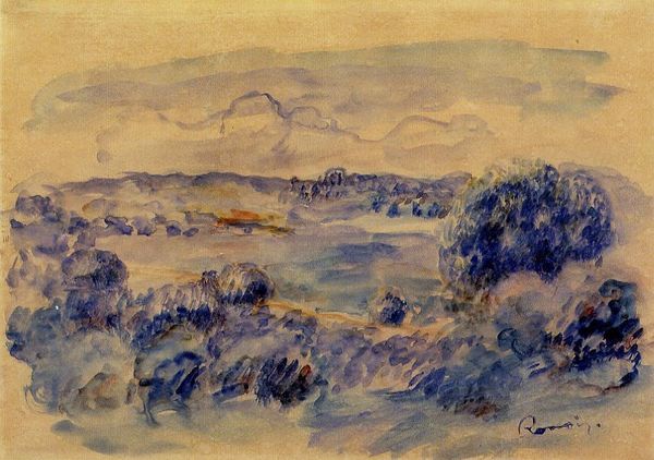 Curator: This is Renoir’s "Landscape" from 1881, currently held in a private collection. What strikes you initially about this particular glimpse of nature? Editor: Well, the canvas is speaking volumes, isn't it? I mean, look how the visible weave becomes part of the atmosphere— almost blurring the forms. It is as if Renoir wanted the texture of the linen itself to be a participant in rendering light. Curator: Exactly. He captures the impermanence of a scene with such swiftness, "en plein air" style, working so deftly, but also giving us this raw materiality. I feel that lack of overworking. It reminds me how much his process involved walking away, knowing when to stop... Editor: Speaking of 'stopping,' the bare minimum of brushstrokes also prompts me to think about the kind of brushes used here, right? Hog bristle perhaps, loaded generously? He clearly favored bold applications. Also, look at how those colors mingle directly on the canvas... there's a dance between premeditation and pure chance happening right before us. Curator: I like that—the dance. And there's such an earthy harmony, the browns melting with delicate mauves and hazy blues in the sky... The forms are softly muted. For me, this creates an emotive quiet. It makes you feel as though you could simply step into the scene. Editor: While it's tempting to simply admire this "snapshot," one can't forget Renoir's relationship to industrial pigments. These landscapes weren't just emotional escapes; they were products made with commercially manufactured colors made accessible to artists like never before! It also invites questions about the artist's market and patronage. Curator: Good point. Thinking about the materials opens doors to other conversations. For me, ultimately this "Landscape" offers an intimate look into Renoir's sensibility— the feeling is more important than meticulous detail. Editor: And for me, seeing this almost as a relic of artistic production prompts a valuable reflection upon how something apparently timeless carries embedded conditions related to production and the artist's circumstances.