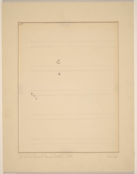 Curator: Looking at this work by John Cage, "Solo for Flute (Concert for Piano and Orchestra): Sketch," made between 1957 and 1958, the first thing that strikes me is the apparent randomness, a kind of organized chaos. Editor: Exactly. It gives the impression of a flurry of creative material: ink on paper, almost like capturing ephemeral ideas. There's a tension here between precision and improvisation inherent in Cage's work, I think. What do you find particularly compelling about his process? Curator: For Cage, materials weren't precious, nor was the finalized product above all. This sketch gives us access to Cage's working methods. You can observe what seem to be chance operations being applied directly onto the musical score. Notes, numbers, annotations all intertwine; the labor becomes visible. He is decentering conventional notions of artistic composition through the demystification of labor and materials. Editor: Absolutely. The role of chance and indeterminacy are really central to his broader historical significance, and to mid-century cultural anxieties surrounding control and order after the war. The messiness, which I appreciate, also reflects that era's larger disruption of tradition in musical and artistic contexts. Curator: I’d push back slightly and add, I don’t see it just as a reaction, but as an active deconstruction. Consider the paper quality. It is probably a relatively inexpensive material to produce serial music. By not fetishizing these materials, Cage highlights music production and democratizes access, almost encouraging anyone to engage in the process. Editor: A very relevant point about inclusivity! Cage aimed to dissolve barriers and create accessibility, so this approach makes sense in his social vision, and its broader reception in countercultural circles from the 1960s on. How does the musical notation itself factor into your thinking? Curator: The traditional form offers both structure and something to disrupt, offering viewers ways to perceive the role that material reality played for him. It’s a crucial dialogue in this sketch. Editor: Indeed, understanding Cage involves more than the final artwork, and this sketch does allow a glimpse into the complexities and considerations behind the art. It reminds us how profoundly artwork both influence, and are influenced by, socio-historical moments.