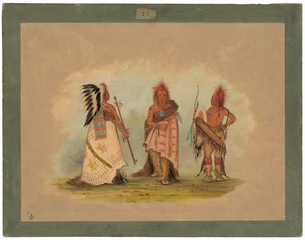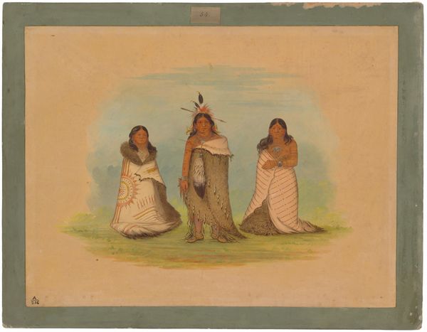George Catlin made this watercolor titled "Pawneepict Chief, Two Daughters, and a Warrior," using watercolor on paper. Catlin's choice of watercolor offers soft tonal effects. With thin washes and delicate strokes he captured a sense of immediacy. The paper itself is a commodity, but one readily available to Catlin. His application gives the figures a presence without weight, almost like ghosts on the page. Catlin’s artistic approach documents indigenous peoples, yet it also reflects the power dynamics of the time. He was an outsider, creating images for a Western audience. The artwork thus becomes an artifact, shaped by social and cultural context. It prompts us to reflect on the labor of representation, the role of the artist as a cultural interpreter, and the ethics of depicting others. The image invites viewers to consider not only what is shown, but how it is made. The artist’s hand, the paper, and the watercolor all contribute to the making of meaning.