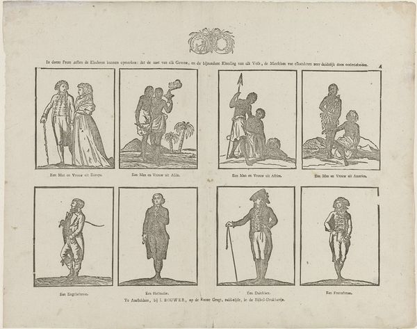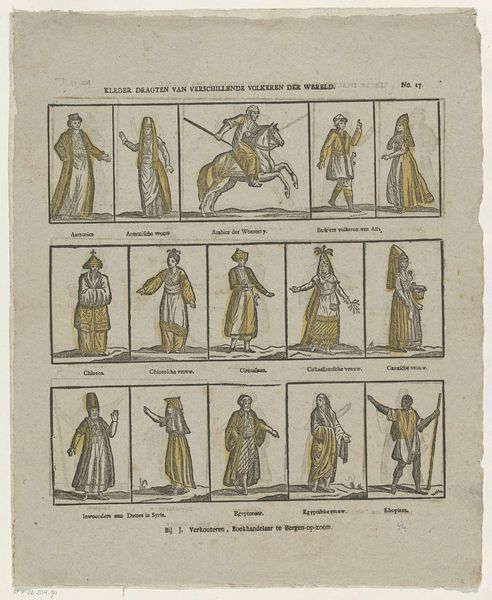 Erve H. Rynders' print presents a series of figures representing different nationalities, accompanied by short verses. The piece invites viewers to "behold these strange peoples here, O dear youth, with much pleasure." Made during a period of extensive Dutch global trade, this print offers a glimpse into the era's fascination with, and often skewed understanding of, different cultures. Each figure is carefully depicted with distinctive clothing and accessories meant to signify their origin. Yet, these representations are mediated through a Western European lens, reflecting the biases and limited knowledge of the time. The verses accompanying each figure offer observations that range from curious to stereotypical, revealing the complex interplay between genuine interest and cultural prejudice. The emotional impact of this print lies in its ability to evoke a sense of wonder and curiosity about the wider world, while simultaneously highlighting the pitfalls of ethnocentric perspectives. It is a reminder of how cultural exchange can be both enlightening and fraught with misunderstanding, inviting us to reflect on our own perceptions of others.
