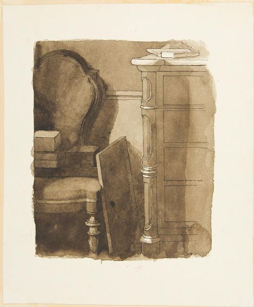Curator: Gwen John’s “A Corner of the Artist's Room, Rue Terre Neuve, Meudon,” created between 1915 and 1919, is a watercolor drawing that immediately feels...intimate. Editor: Yes, a very quiet intimacy. The subdued palette and sparse composition evoke a feeling of solitude, almost monastic. The textured paper feels very intentional. Curator: Indeed. This drawing presents a humble domestic space – a corner, quite literally – inviting considerations about the daily practices of the artist. One wonders, what are the material conditions of John’s creative labor in Meudon during the first World War? Editor: Precisely. How do these spaces – particularly for a woman artist in the early 20th century – influence the production of art, and perhaps more importantly, the construction and limitations of identity? It looks like quite a solitary existence. Curator: Watercolor allows for fluidity but is also susceptible to mistakes. Did the limitations imposed by her lifestyle also filter into John's artistic choices, making watercolor the readily available and useful choice for sketching, planning, and executing her creative ideas? Editor: The almost clinical detachment also reveals a certain degree of privilege. While portraying her subjective experience, John remained part of the modernist art circle, showing in the same spaces and using the same galleries as men like Matisse and Picasso. Curator: True, and John made specific material and artistic choices throughout her career. Her exploration of interiors as sites for art making is really an explicit effort to disrupt boundaries between what's viewed as women's work – the domestic – and fine art. Editor: John, though a complex and, at times contradictory figure, pushed against the grain in an important way for subsequent generations. This artwork makes her perspective palpable and very timely for audiences even today. Curator: It really urges viewers to think about not only the physical but also the social and intellectual architecture that fostered or prevented creativity. It feels special to appreciate such delicate interiority in such bold times.