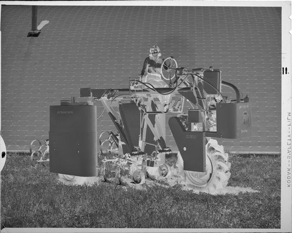Curator: This is an Untitled photograph by Jack Gould, held here at the Harvard Art Museums. It depicts the rear of a street-sweeper clearing debris. What’s your initial take? Editor: The stark inversion immediately grabs me. The negative space amplifies the grit, the labor, the very act of cleaning becomes almost brutal in this light. Curator: Precisely. The inverted tones disrupt our expectations, highlighting the often-invisible labor of sanitation work. Consider the social implications of depicting these workers. Editor: The composition itself is masterful. The strong diagonal of the sweeper arm bisects the frame, creating a dynamic tension between the mechanical and the human. Curator: And note how the lack of specific detail regarding date or location universalizes the scene, speaking to broader themes of class and labor across time. Editor: Ultimately, Gould's choice of inversion pushes us to reconsider the aesthetics of the everyday, compelling us to find beauty, or at least significance, in the mundane. Curator: Indeed, Gould prompts us to confront the sociopolitical undercurrents present in even the simplest of urban scenes.