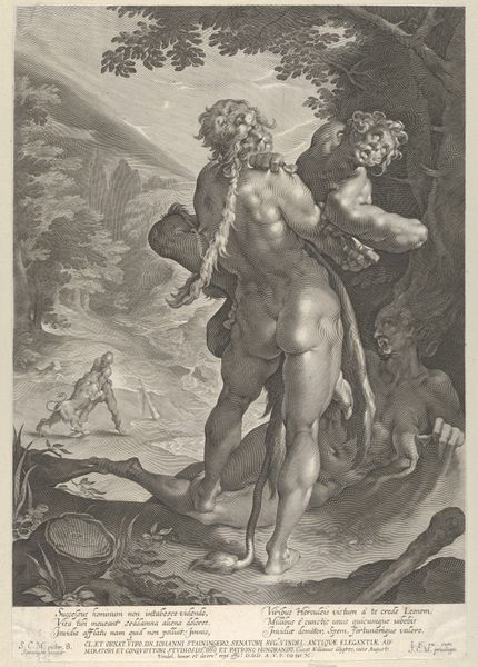 Editor: So here we have "Pluto," an engraving by Hendrick Goltzius from 1594. I am really drawn to the drama of the piece. You’ve got this powerful, almost theatrical figure in the foreground against a backdrop of what looks like utter chaos. It's intense! What’s your take on this, and what cultural context informs it? Curator: Well, seeing as Goltzius was a master of Mannerism, we have to consider the art world's audience at that moment in time and how artists and intellectuals actively distanced themselves from the norms established during the Renaissance. We must consider how artists turned toward extreme elegance, artificiality, and stylized exaggeration; so what might be the social, political implications? And how might the museum play into this reception, if at all? Editor: Hmm, that’s interesting… You mentioned artificiality, and I agree; there’s something staged about it. Do you think that’s maybe because printmaking catered to the sensibilities of the elites at court? Is there a certain...performance happening? Curator: Precisely. Goltzius’s prints like this one became valuable commodities. They circulated in a market driven by discerning collectors and influential patrons. Consider the symbolism as well – the spear, the shield, and crown evoke status, even tyranny. Editor: Okay, I get it. It's like Goltzius is making a statement about the ruling class itself through this depiction of Pluto. Curator: Absolutely. He’s not just depicting a mythological figure; he's commenting on power structures and the perceived excesses of authority figures. These are very political decisions manifested in image. Editor: Wow. It’s amazing how much can be read into what seems like just a scene from mythology! It makes you wonder what kind of visual arguments artists will be making now that social media plays into viewership. Curator: Indeed. Understanding this interplay is crucial to how we interpret historical and contemporary art in galleries, online, or beyond.