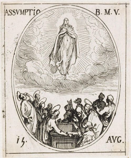 Curator: This is Jacques Callot's "Transfiguration," a remarkably detailed etching, only a few centimeters across, housed here at the Harvard Art Museums. Editor: Wow, it's so tiny! But it still radiates a sense of grandness, almost like a miniature window into another realm. Curator: Callot, living from 1592 to 1635, would have been deeply immersed in Counter-Reformation ideas. The Transfiguration story became a powerful message about divine authority amid religious conflicts. Editor: And you can see the drama played out in the contrast: the grounded, kneeling figures versus the radiant, ascending one above. It's like, who are we, but who could we become? Curator: Exactly. Consider the social implications—who is allowed access to such divinity? What earthly power structures are being challenged or reinforced? Editor: It's incredible how much he conveys in such a small space. I'm walking away contemplating power, scale, and the potential held within the ordinary. Curator: Indeed, a testament to art's capacity to transcend both size and time, inviting us to question established norms.