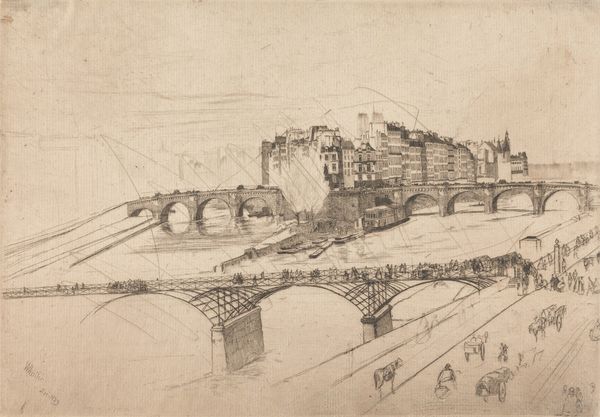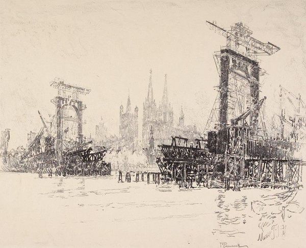 Joseph Pennell’s drawing, Building the Bridge, probably made with graphite or ink, is all about the process, a kind of dance between the artist and the emerging structure. The marks feel like they're building the bridge right before our eyes. Look at the gondola dangling high above the bridge. You can almost feel the dizzying height, the precariousness of the situation, through Pennell’s delicate, yet assured lines. The texture of the paper peeks through, adding a sense of immediacy, as if the drawing were made on-site, capturing a fleeting moment. It reminds me of Piranesi's etchings of imaginary prisons, but with a hopeful, forward-looking energy. Both artists, though, share a fascination with the poetics of space and the drama of perspective. It's not just a drawing of a bridge; it's a drawing about building, about progress, and about the human endeavor to shape the world around us.
