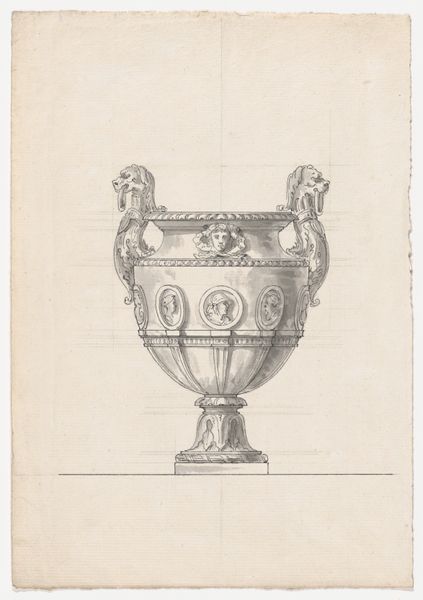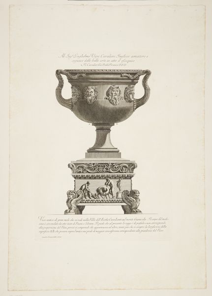 Editor: Here we have "Three Antique Vases, One on a Pedestal," an etching and engraving by Giovanni Battista Piranesi, from 1778. The intricate details really strike me. What do you see in this work, especially from a formalist point of view? Curator: This print offers a study in contrasting forms. Observe how Piranesi arranges the vases, differing in size and ornamentation, within the rigid frame of the engraving. The stark contrast between the white background and the dense linework emphasizes the textures of the imagined marble. The composition creates an intriguing tension. Editor: Tension? Could you elaborate on that? Curator: Certainly. The central vase, elevated on a pedestal, asserts a visual dominance, while the flanking vases, though smaller, are rendered with equally meticulous detail. Notice also how the eye is drawn upwards along the vertical axis, constantly met with complex ornamental patterns which are then pulled outwards by the objects' edges. Do you see how this interplay influences the viewers' perspective? Editor: I do! It's like a visual game of push and pull. The textures, too, almost trick you into thinking this is a study of actual, three-dimensional objects, not just lines on paper. Curator: Precisely. Piranesi has carefully articulated this. He plays with line weight and density to suggest depth and volume and light which engages us and showcases both design and the potential for pure artistry of engraved lines. The subject almost becomes irrelevant; it's more about *how* it's shown. Editor: That's fascinating. I'd never considered the push and pull of composition to be so crucial in a seemingly static image like this. Thanks! Curator: It is precisely through the analysis of these formal relationships that we can perceive Piranesi’s mastery of his medium and composition. I find it reveals something unique, every time I revisit the image.