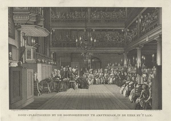Curator: This print, crafted by Reinier Vinkeles in 1796, is titled "Algemene Centrale Vergadering in Den Haag, 1795," and it's currently housed in the Rijksmuseum collection. Editor: The atmosphere is strikingly formal; a vast interior space, sharply defined through linear perspective and filled with men who appear to be deeply immersed in their own separate huddles. Curator: Indeed, Vinkeles meticulously captured the General Central Assembly held in The Hague. What strikes me is how this gathering signifies a pivotal moment of revolutionary upheaval in the Netherlands. It serves as visual testimony to the Patriots' push to implement democratic reforms against the old order of the Stadtholder. Editor: Looking at the visual language, the artist has a flair for the geometric; the severe grid of windows set against the repetition of circular tables. There's also an interesting contrast between the regularity of the hall, against the irregularity of men assembled there. Curator: The engraving speaks to the emergence of new power dynamics; where citizen engagement becomes a cornerstone of political change. Consider how spaces like this one became fertile ground to foment intellectual discourse and action toward creating a new social contract rooted in principles of representation. Editor: It's amazing how Vinkeles uses subtle tonal modulations in the engraving to articulate this bustling yet contained atmosphere. Each figure, despite their small scale, carries an individual presence achieved with such minute detail. The architectural forms give structure to what might otherwise feel completely disordered. Curator: These assemblies really shifted concepts of identity. They opened possibilities for citizens from different walks of life to partake actively in redefining the course of history by breaking through limitations based solely upon noble birthrights. This challenges prior concepts of nationhood. Editor: I appreciate that its subdued monochrome allows such close focus on architectural detail. The composition as a whole balances horizontal expansiveness against that deep recession into space, giving it dynamic tension. Curator: Precisely, viewing the piece through a lens of social history gives depth that simply considering the medium or structure could not. Editor: I find new beauty when the elements and concepts integrate. It highlights how technique and artistry carry historical weight.