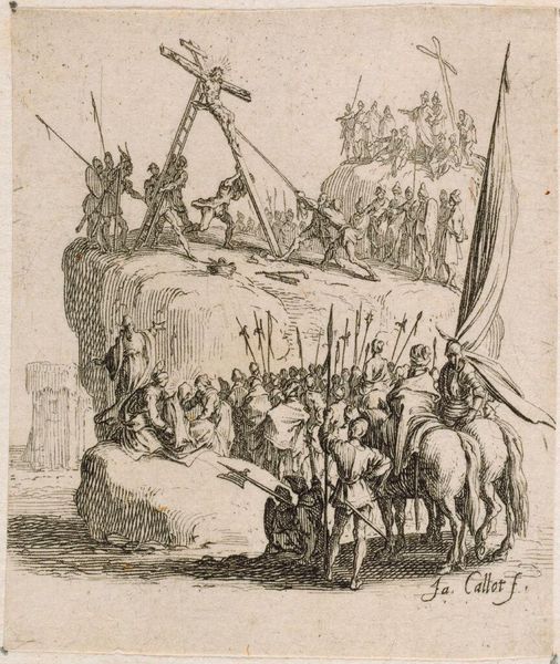 Editor: This intricate engraving, "Bearing of the Cross," by Jacques Callot, presents a dense scene. I'm struck by the way the artist uses line to create a sense of depth and movement. What can you tell me about the formal qualities of this print? Curator: The artist’s strategic deployment of line weight directs our gaze. Observe the concentration of dense, dark lines in the foreground, gradually lightening as they recede. This meticulous gradation constructs a palpable sense of depth. Note also the architectural elements, meticulously rendered, serving as structural anchors. Editor: So, the density of the lines in the foreground really pulls us into the scene. I hadn't noticed how carefully constructed the architectural backdrop is. Curator: Precisely. And consider the interplay between the ordered architecture and the chaotic crowd. How does that contrast contribute to the overall composition? Editor: I see it now; it adds tension. Thank you for highlighting the visual structure. Curator: Indeed, the composition offers a rich field for contemplation.