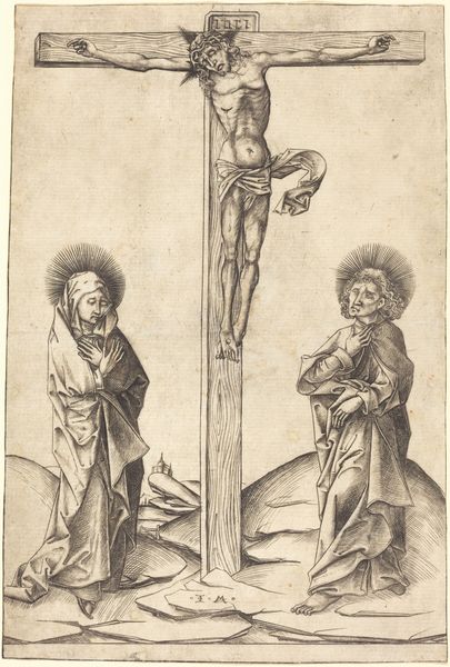 Editor: This is “The Crucifixion,” an engraving by Martin Schongauer, its date is unknown, currently residing at The Art Institute of Chicago. What strikes me most is the starkness. The fine lines create such detailed figures, yet the scene feels so desolate and raw. What do you see in this piece, something I might be missing? Curator: You’re spot on – it’s a raw depiction, isn't it? For me, it’s not just about religious iconography, but a profound exploration of human suffering and resilience. Notice the skulls at the base of the cross – a potent memento mori, reminding us of our own mortality but maybe hinting at our shared fate. I wonder what he was thinking while using intaglio and engraving to bring all the drama here? Editor: So the skulls aren't just props but like, a Vanitas symbol? Curator: Precisely! And look at the faces of Mary and John – their grief isn’t sentimental, but deeply human. Schongauer was a master of detail, look at all those carefully engraved lines on the clothing! He knew how to balance realism and emotion with this artistic choice, don't you think? It’s like he's saying, "even in immense suffering, dignity endures." Editor: That's fascinating, how the small details give such depth to the whole image! Seeing the skulls now, it adds another layer of reflection on death and dignity within the context of the composition. Thank you. Curator: Exactly. Art becomes like a mirror. Hopefully next time, it'll reflect an even better perspective.