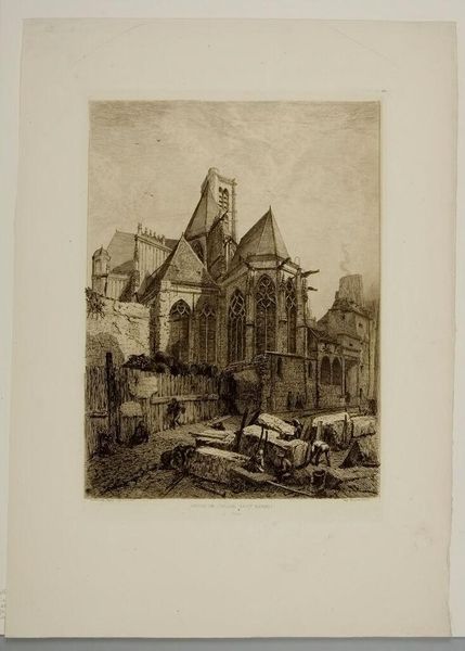 Curator: Today we’re looking at Carel Frederik Bendorp’s "Kapel van het Sint Agnietenklooster in Dordrecht," a pencil drawing from 1872. Editor: My first thought? It feels… spectral. The lines are so delicate, the tone almost ghostly, like peering into a faded memory. The texture reminds me of an old engraving. Curator: It does evoke a sense of the past. I’m intrigued by Bendorp's choice to depict the chapel in this manner. The Sint Agnietenklooster, or Saint Agnes Convent, carries centuries of history. He’s not just showing us a building, but perhaps hinting at the layers of faith and community that once resided here. Do you see how the high arched entrance commands visual focus? Editor: Absolutely, the lines pull the eye upward immediately, but consider the artist's process—the hatching, the cross-hatching—it's all so meticulously rendered. Bendorp emphasizes volume and depth, yet, as I observed at the start, in this restrained tonal palette. I think the restricted scale reinforces the solemn impression. Curator: The building, specifically the church entrance, becomes an almost figurative symbol then? As if this imposing archway is inviting the faithful inside. The archway’s height can also symbolize hope and optimism that can be observed from many religions that value archways. Editor: A compelling notion. We're not merely seeing an architectural study, but a meditation on devotion itself. Even the slight tilt in perspective lends a degree of dynamism that keeps it from feeling entirely static. Curator: And think about what monastic life meant. A removal from the worldly, a turning inward. Bendorp captures that sense of contemplative enclosure even as he renders the exterior facade. A kind of "spiritual geography", where the architecture serves as a vessel for collective hopes. Editor: Right. Beyond mere surface representation, it suggests something more deeply felt, encoded in the structure itself. Perhaps Bendorp sought to capture the "soul" of the building. Curator: Exactly, and the act of sketching itself… almost a devotional practice of closely observing the historical forms and its meaning. Editor: Well, I for one feel invited to examine it for hours! Curator: Indeed. It makes you reflect about architecture’s cultural continuity and its enduring symbolic resonance through time.