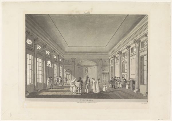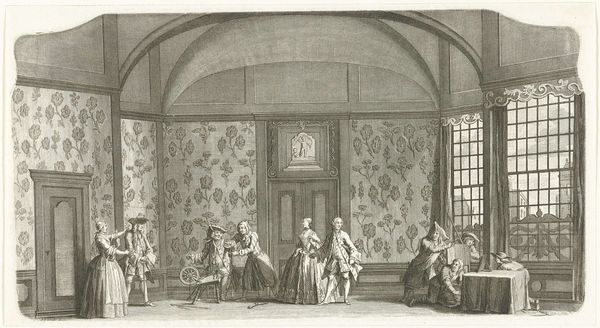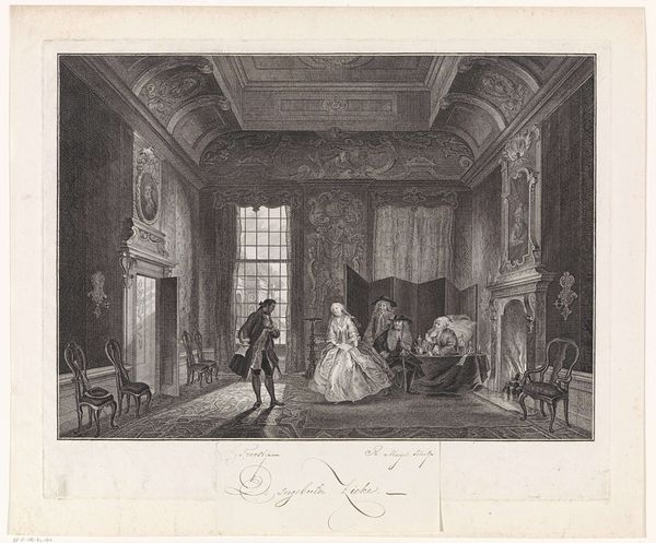 Dirk Langendijk's 'Wachtlokaal voor officieren' captures a military guardroom scene in pen and gray ink, offering a glimpse into the rigid formality of 18th-century life. The composition, dominated by receding lines and rectangular shapes, is striking for its measured perspective and balanced arrangement. The almost monochromatic palette, punctuated by subtle gradations, lends the space a serene yet austere atmosphere. The artwork's power lies in its representation of spatial order and social hierarchy. Langendijk uses linear perspective not merely as a technique but as a means of structuring power relations within the room. The play of light, streaming in from the windows, enhances the geometric precision, underscoring the structured environment. Ultimately, 'Wachtlokaal voor officieren' is a study in form and function. The formal elements serve to reinforce the values of order, discipline, and hierarchy inherent in the military context. This piece stands as a testament to how an artist can use line, space, and composition to explore the socio-political dimensions of a seemingly simple interior scene.