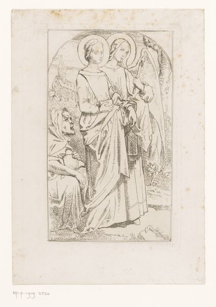 Curator: Today we're looking at Heinrich Vianden's etching, "Vrouw van Potifar beschuldigt Jozef," made in 1844. Editor: My first impression is of delicate chaos! The scene feels charged, almost theatrical, with swirling lines giving a sense of urgency. Curator: Vianden's choice of etching really lends itself to the narrative. The incised lines into the metal plate allowed for mass production, making these biblical stories accessible to a wider audience, fostering social commentary through readily available images. Editor: Absolutely. And look at how Potiphar's wife dominates the visual field. The symbol of feminine betrayal, fueled by thwarted desire, is powerful, especially considering the period's constraints on female agency and expressions of desire. Her draped, almost classical dress contrasts interestingly with Joseph's simpler, almost childlike attire, suggesting innocence. Curator: Good point. Think of the materiality of those costumes. Perhaps they were made of simple, locally sourced textiles and garments produced via a guild system in Vianden's time. Consider that versus the imagined opulence and supposed 'purity' that Vianden might be projecting back to the ancient world represented here. It suggests anxieties regarding the contemporary class structures. Editor: Fascinating. Note also the watchful figures overhead. That detail acts as a constant, voyeuristic presence, signifying social surveillance and how people behaved depending on observation during the time period that Joseph represents, with a symbolic judgment from above. Curator: The means of creating the image are very important to keep in mind. These etched prints had an almost democratizing effect for a society starting to come to terms with an emergent middle class in Europe, which Vianden also helped define and portray. Editor: And isn't it striking how timeless and universal this story of betrayal and accusations continues to be? It really emphasizes the visual vocabulary employed to keep this very old narrative accessible. Curator: Exactly. This work serves to show how deeply enmeshed both materiality and iconography become when trying to decode cultural anxieties of an era gone by. Editor: I think that analyzing how images continue to carry a profound psychological, historical weight within any culture is one of art history's strongest qualities.
