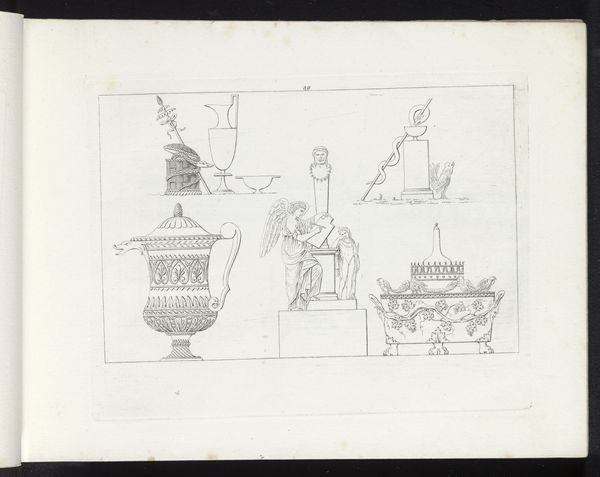Curator: Well, the artist here, Pietro Ruga, created this pen and ink drawing titled "Twee scharen, een bijzettafel, twee urnen en een schaal," which translates to “Two pairs of scissors, a side table, two urns and a bowl" in 1817. Editor: It’s a fascinating still life… so clinical, yet with a delicate touch in the line work. Almost architectural in its precision. There's a coolness, a distance… perhaps intentional, given the historical context? Curator: Absolutely. The piece embodies the Neoclassical style that dominated the era. Notice the focus on classical forms—urns, the faces... Think about how those shapes connect to the history they evoke and, consequently, what types of consumers would engage with them. The use of drawing aligns with the broader academic art practice that emphasized skill. Editor: It makes me think about the tools required to bring about art: scissors and technical drawings. Also, look how flat everything appears. What does the two-dimensionality do for our reading of craft? Is it being elevated or used in this case as simply a way to portray the objects? Curator: It pushes us to think about the economics of taste and what drove them, literally, as it seems like a page from a catalogue. Imagine commissioning something like this – bespoke scissors and urns. Who would possess such things? It's as if Ruga's meticulous method of craftsmanship emphasizes the market forces that shape what gets crafted. Editor: That is what really gets to the center of the discussion here, right? The influence of the Neoclassical style and taste is obvious... the question then becomes, to whom, why and how was the market impacted by the revival? These aren't just objects; they reflect an ideal consumer. The urns even bring to mind funerary settings and the relationship between the elite class and death. Curator: Very much so. Thinking about all those objects laid out here prompts one to ponder the interplay of artistry, commerce, and social display. The politics of design and who benefits is embedded in every stroke. Editor: It certainly reveals how tastes reflect not only artistic inclinations, but profound class dynamics, to underscore societal aspirations of the time. Curator: Right. Editor: What an intricate image and discussion!