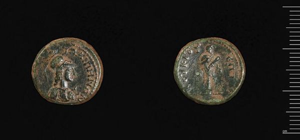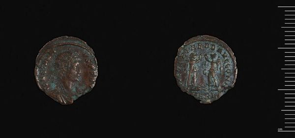 Curator: Oh, this little coin! It's identified as a Coin of Constans I, from Thessalonica. He was quite the ruler, wasn't he? Editor: Intricate, even on this tiny scale. It feels heavier than its actual weight, doesn't it? Like a fragment of a lost world. Curator: It’s a direct message, stamped into metal. Think of the Roman Empire’s projection of power, condensed into something you could hold in your hand, trade with, or bury. Editor: What's fascinating is how these symbols—even worn down—spoke volumes to the people who used them. It’s the original meme, wouldn't you say? Curator: Absolutely. These coins also show the importance of mints, places like Thessalonica being important administrative hubs. Editor: Holding this, you're touching not just metal, but the echoes of trade, ambition, and an empire's reach. I love that about art, it shrinks history! Curator: Agreed! A reminder that even the smallest objects can carry the weight of history.