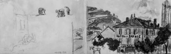 Johan Barthold Jongkind created this drawing, *Landskab med vognskur. Omegnen af Grenoble (?)* with pen and ink. The composition is dominated by stark contrasts between the shadowed foreground and the open, airy landscape beyond. Jongkind's marks are swift and economical, delineating the scene with an emphasis on tonal values rather than precise detail. Notice the contrast between the rough texture of the wagon shed and the smooth, atmospheric rendering of the distant hills. The drawing is divided into two distinct halves, setting up a semiotic tension between nature and human construction. On the left we have the rolling hills, and on the right the structure of the wagon shed. What does this mean? The shed is set against the landscape, perhaps challenging the idea of a unified, harmonious natural world. The ink drawing is raw and ephemeral. Its incompleteness invites us to contemplate the interplay between form and dissolution, and the ways in which art can both capture and question our perceptions of reality.