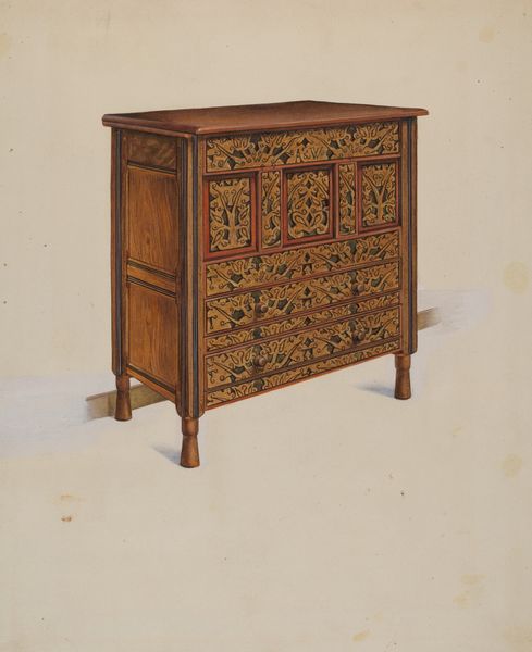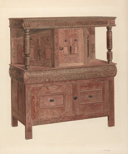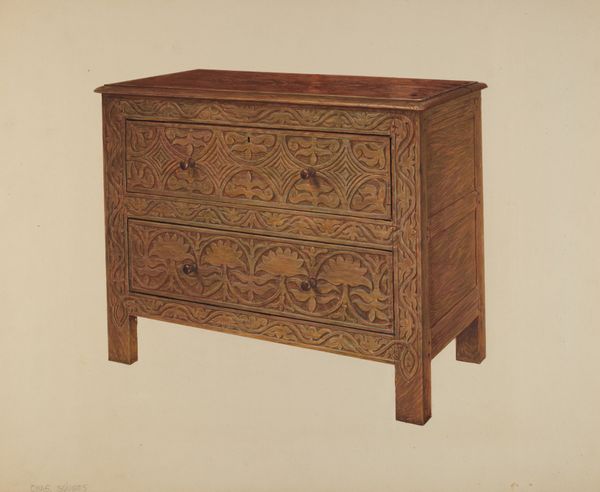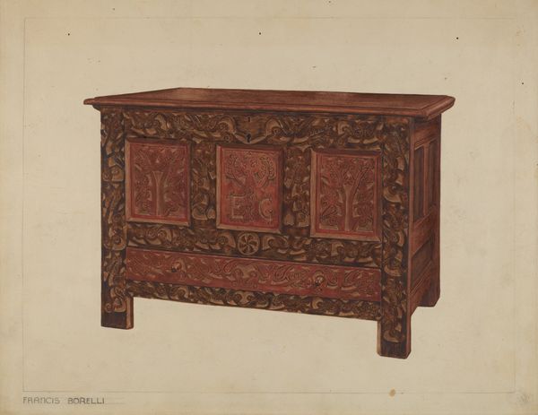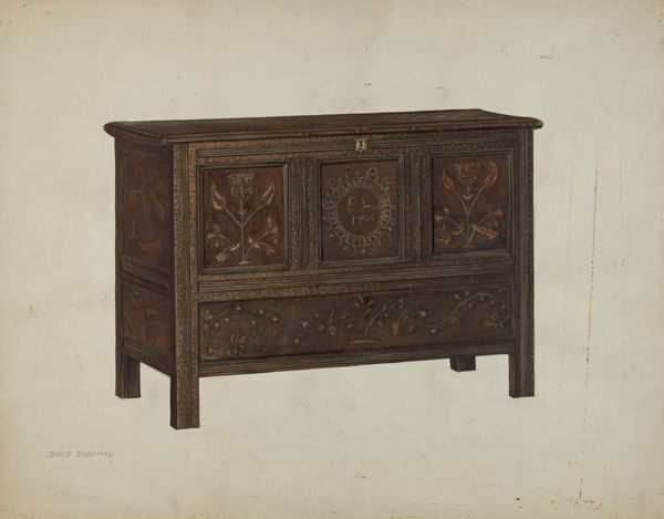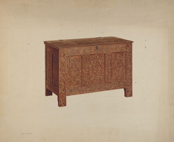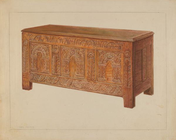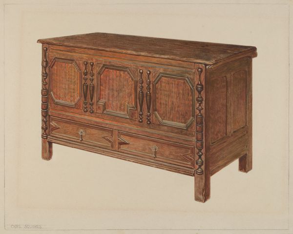 Editor: This is a drawing of a chest by Charles Squires, circa 1937, and it looks like it's made from wood. It looks old, or at least depicts something old, with really interesting carvings. What can you tell me about it? Curator: The chest, rendered with such careful detail, invites us to consider not just its physical presence, but the narrative it holds within its form. Note how the artist has focused on the woodgrain, a potent symbol of time, growth, and enduring strength. How does the texture of the wood contribute to your sense of its age or history? Editor: I hadn't thought about that, but now I see it adds a sense of gravitas. And those decorative carvings – do they have a particular significance? Curator: They certainly suggest a conscious aesthetic choice, reflecting perhaps a specific period or style. The carving's symmetrical, almost repetitive nature suggests a comforting sense of order, a cultural impulse to manage the chaos of the world. What kind of cultural touchstones or feelings does it evoke for you? Perhaps a connection to a family heirloom? Editor: It does make me think of things passed down through generations. So, a chest is literally a container, but symbolically… Curator: Exactly! Think of a chest not merely as storage, but as a vessel holding memories, family secrets, or even cultural identity. This piece becomes an icon, encapsulating the passage of time. The careful depiction invites a personal reflection. Editor: That's fascinating. I guess it's a reminder that even everyday objects can be powerful symbols. Curator: Precisely. This image is an invitation to engage with how ordinary items can represent significant concepts and historical contexts. We are always building shared memories with these pieces. Editor: It's been a really insightful look at something that I would have just seen as an old chest. Thanks!