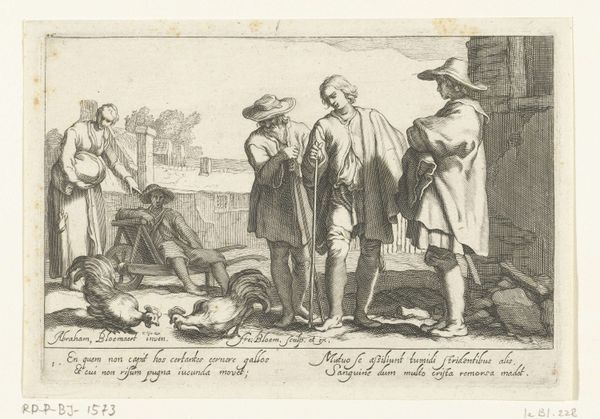 Curator: Frederick Bloemaert produced this engraving and etching entitled "Koken in de buitenlucht," placing its creation somewhere between 1632 and 1670. It’s currently held in the Rijksmuseum. Editor: My immediate impression is one of rustic leisure. There's a sense of casual comfort, despite the somewhat crude cooking arrangement and the hard ground. Curator: "Rustic leisure" is a great way to put it. Consider that in the context of the Dutch Golden Age, prints like these weren't just images. They circulated ideas, representing daily life but also broader societal values. Think about how prints were a major vehicle for distributing information at the time. Editor: It's striking how the artist uses light and shadow. The firelight casts dramatic shadows, particularly on the seated figure, drawing my eye there immediately. What does that say about their social standing, or perhaps, even the narrative’s focus? Curator: Perhaps. While these groupings often evoke images of peasant life, there is a conscious construction involved. Notice how the figures' clothes, while not lavish, still hold a certain amount of detail. Bloemaert likely intended the scene to resonate with a more educated audience, using "common" imagery to discuss larger social matters. Editor: And what about the cooking pot itself? It looks like a simple, everyday item, but even humble objects can carry considerable weight. Cooking and food are fundamental needs, after all. This scene highlights themes of communal sustenance and shared experience. Curator: Indeed. Consider also the location: "in de buitenlucht", outdoors, implies freedom but also the lack of structural stability. Editor: That outdoor setting also lends an element of timelessness. While specific details place it in a particular historical period, the themes of food, rest, and human interaction feel eternally relevant. This print is not just a historical record; it’s a reflection of enduring human experiences. Curator: Absolutely. And the choice of etching, combined with engraving, demonstrates a canny sense of materiality, as well as an effort to convey something of this enduring quality of rustic life through form as well as content. Editor: It certainly does, as the light and shadow interact here with potent and persuasive effect.