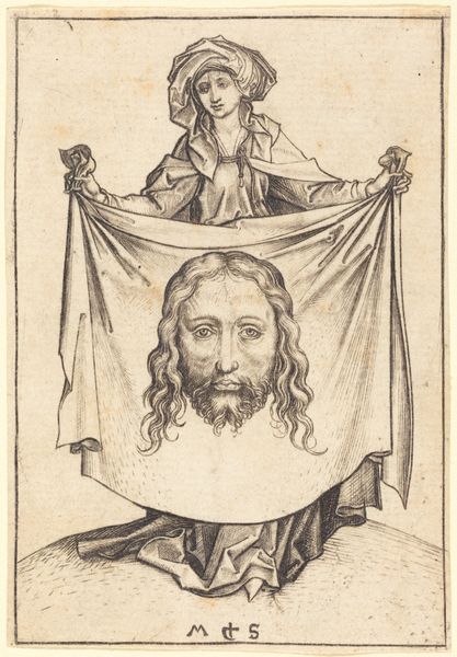This is The Sudarium, made by Anthonis Sallaert, who was active in the 17th century. It's an engraving - a print pulled from a metal plate, in this case using only one color, black. The medium is really key to understanding this image. Engraving allowed for the mass production of images, fueling the spread of religious iconography throughout Europe and beyond. Note how the image is presented as if on a textile, yet is of course just ink on paper. The image itself shows the face of Christ after the crucifixion. The lines are sharp and precise, indicative of the engraver’s skill. The use of a single color creates a stark, dramatic effect. The image is both intimate and iconic, a devotional object made possible through skilled labor and distributed through a growing economy of images. Consider the amount of work involved in creating the original plate, and how it could then be reproduced endlessly. Sallaert made a virtue of that repetition; even in a unique impression like this one, the mechanical character of the engraving process is evident. This was devotional art for a modern, increasingly industrial world.